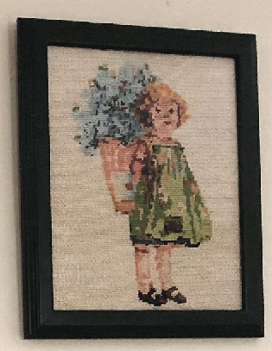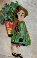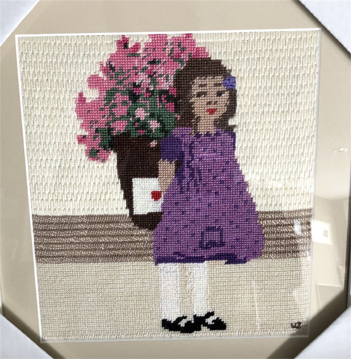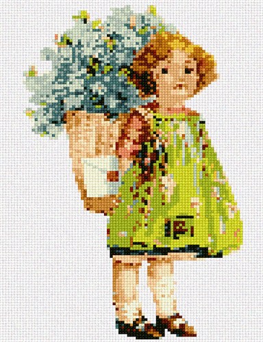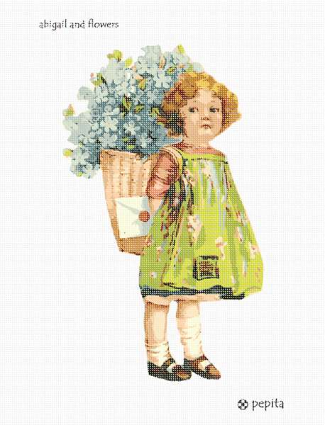 A little girl from long ago, tries unsuccessfully to conceal an oversized flower basket behind her. A sealed letter grasped in her hands catches the eye, evoking romance and mystery in beautiful soft pastel colors. Based on vintage artwork.