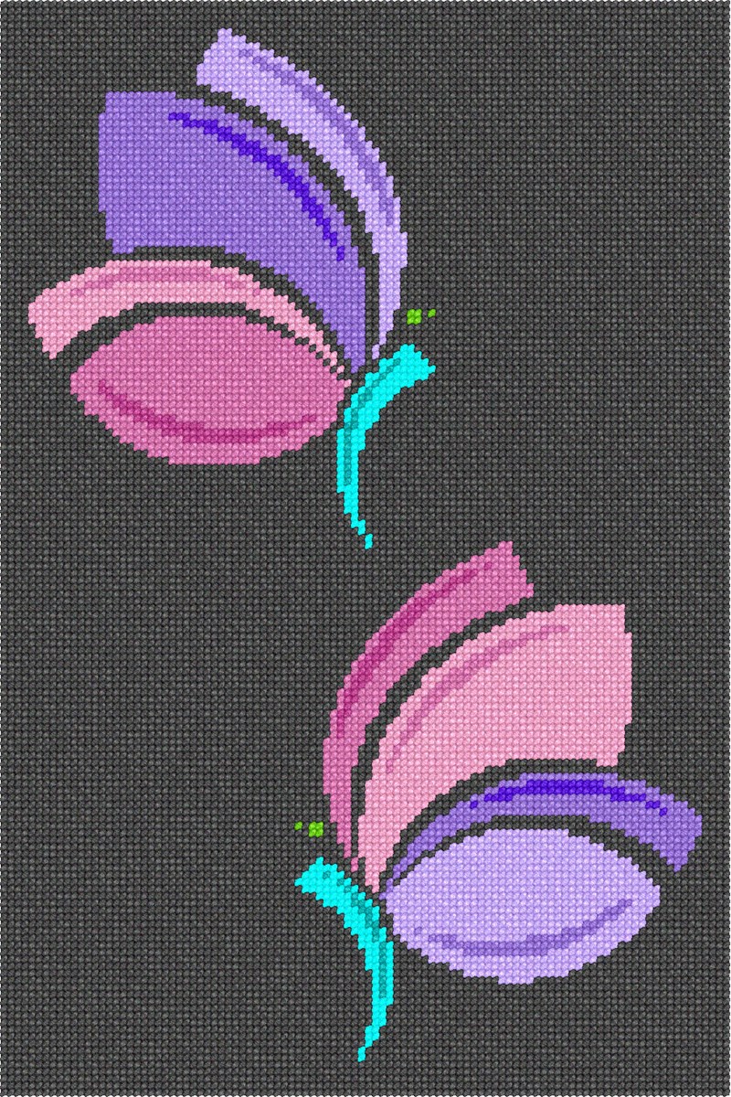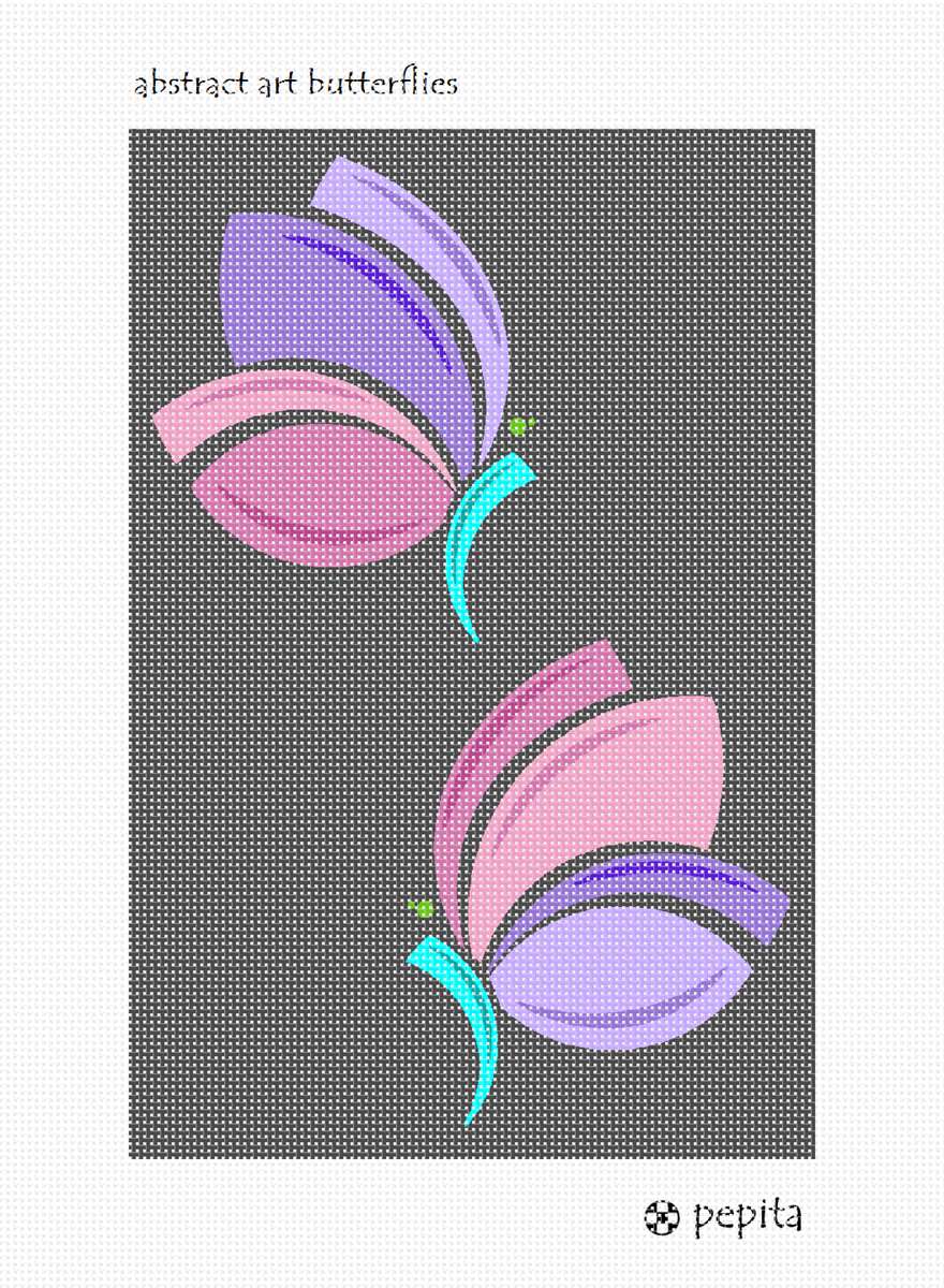 Two butterflies that are abstract designs. They resemble petals of an unfurling flower. Stitch this easy beginner needlepoint that is modern for today's world too.