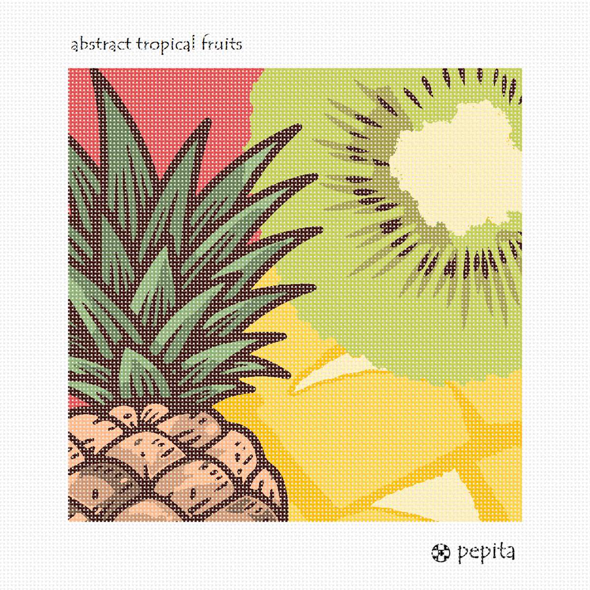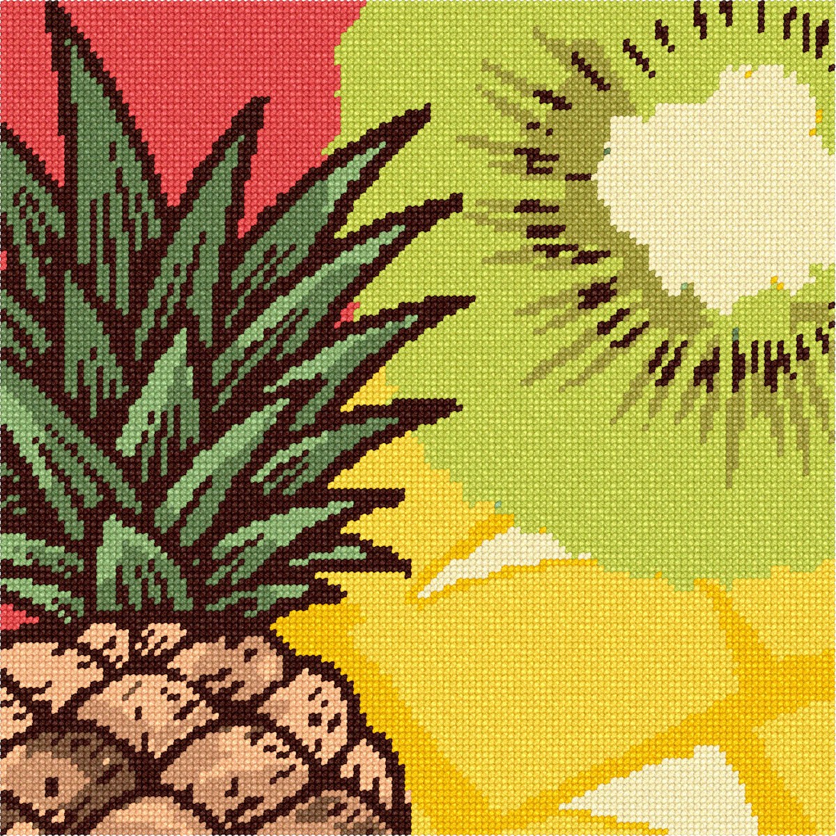 Mango, pineapple, and kiwi collage in needlepoint.