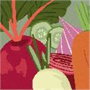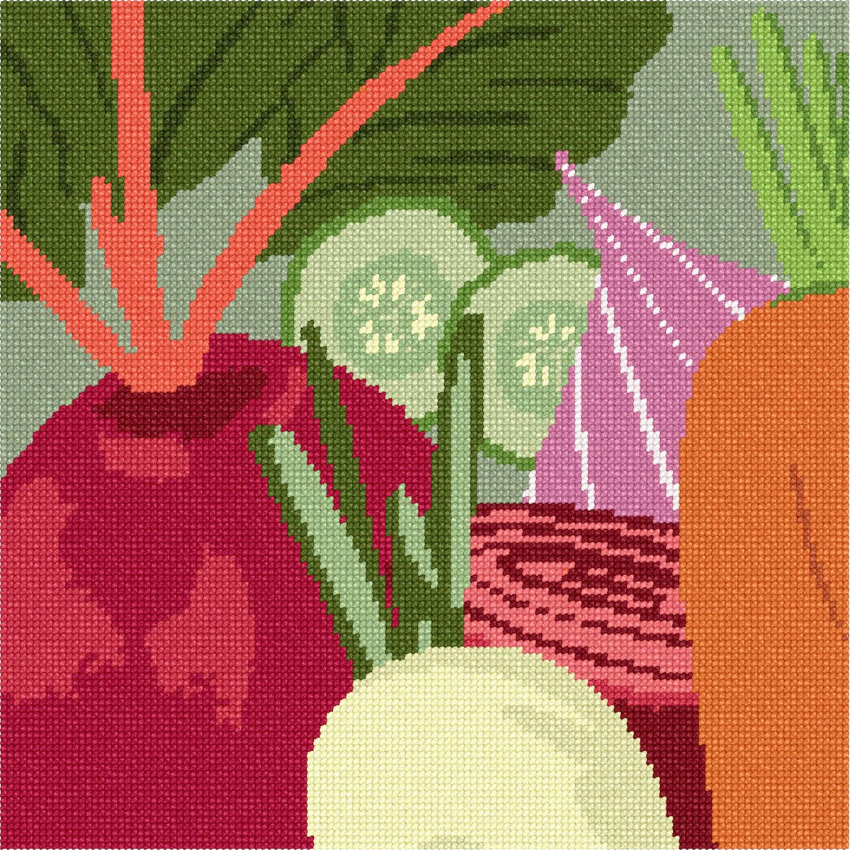 Carrot, parsnip, cucumbers, purple onion, and turnips make up this vegetable needlepoint collage.