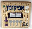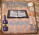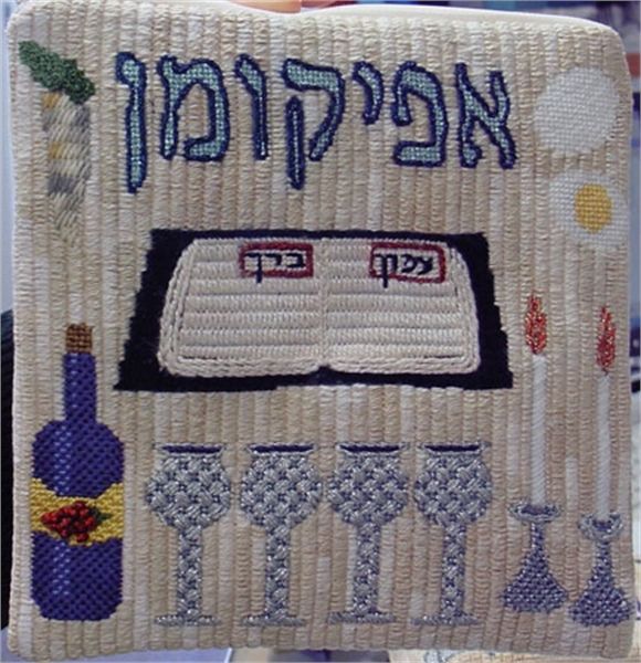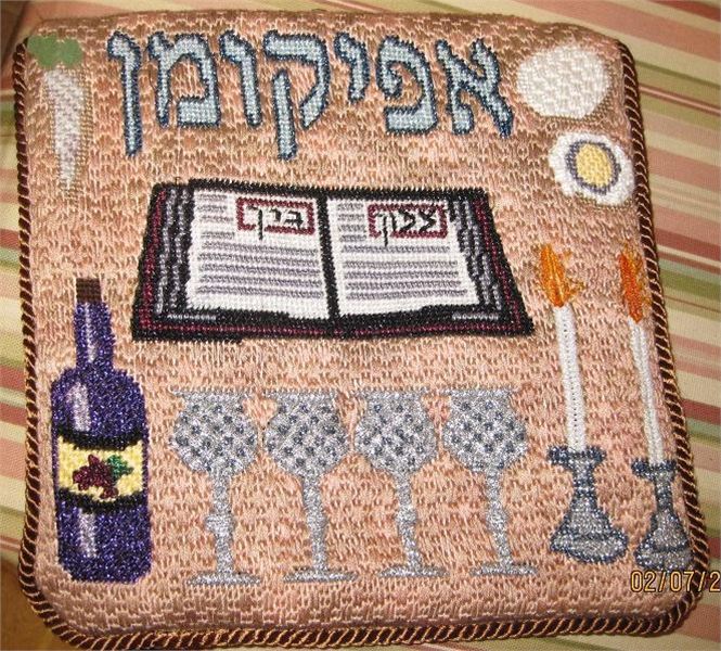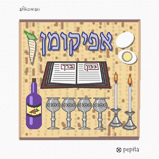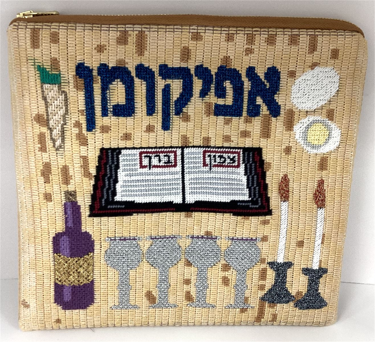 A stitchable Afikoman bag, for the last piece of matzoh eaten by the Passover seder. This bag looks like a piece of matzoh.It has the four cups, a bottle of wine, candlesticks, a hard boiled egg, and a horseradish. All that's missing is the shank bone. We place a piece of matzoh in an afikoman bag at the Pesach seder. Why? The simple reason that we put the afikoman aside or hide it, is because we will eat this matzoh only near the very end of the Seder, and we don’t want it to get mixed up with the other matzohs at the table. In addition, when putting aside the afikoman matzoh, the custom is to wrap it in some sort of cloth or napkin as a remembrance of the way the Jews left Egypt with their soon-to-be matzohs, as described in the Torah. The people picked up their dough when it was not yet leavened, their leftovers bound in their garments on their shoulders. Some have the custom to hide the piece of matzoh that was set aside for the afikoman, and have the children find it and then return it only in lieu of a promised gift. This custom is based on a statement in the Talmud: We snatch matzohs on the night of Passover in order that the children should not fall asleep. In other words, the game of hiding the afikoman and the accompanying bargaining for a gift is an activity to engage the kids and make sure that they don’t fall asleep during what is invariably a long evening. Others do not have the custom for the children to take or steal the afikoman, for fear that the activity would give them a taste of stealing. This design was featured in Needlepoint Now Magazine.