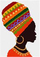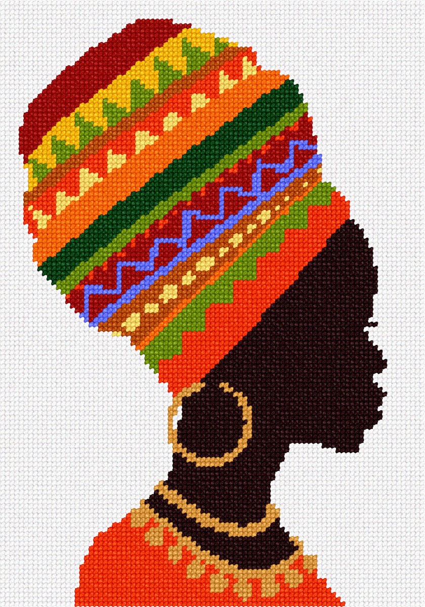 Discover the vibrant elegance of this striking artwork, showcasing a stunning silhouette adorned with a richly colored, intricately patterned headdress. The bold geometric motifs in shades of red, orange, green, and blue exude cultural richness and artistic flair, perfectly accentuated by golden accessories that add a touch of opulence.