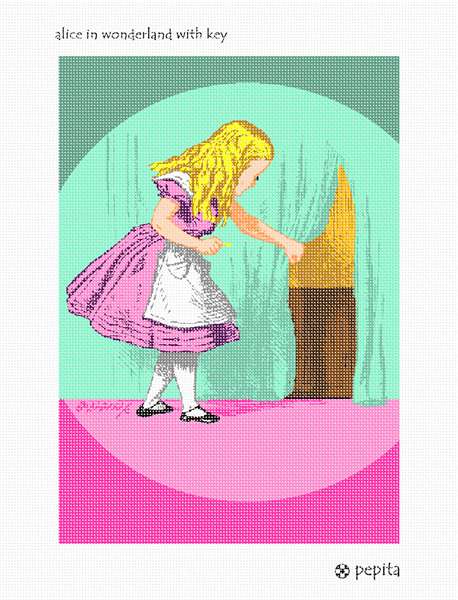 On the second time round, she came upon a low curtain she had not noticed before, and behind it was a little door about fifteen inches high: she tried the little golden key in the lock, and to her great delight it fitted!