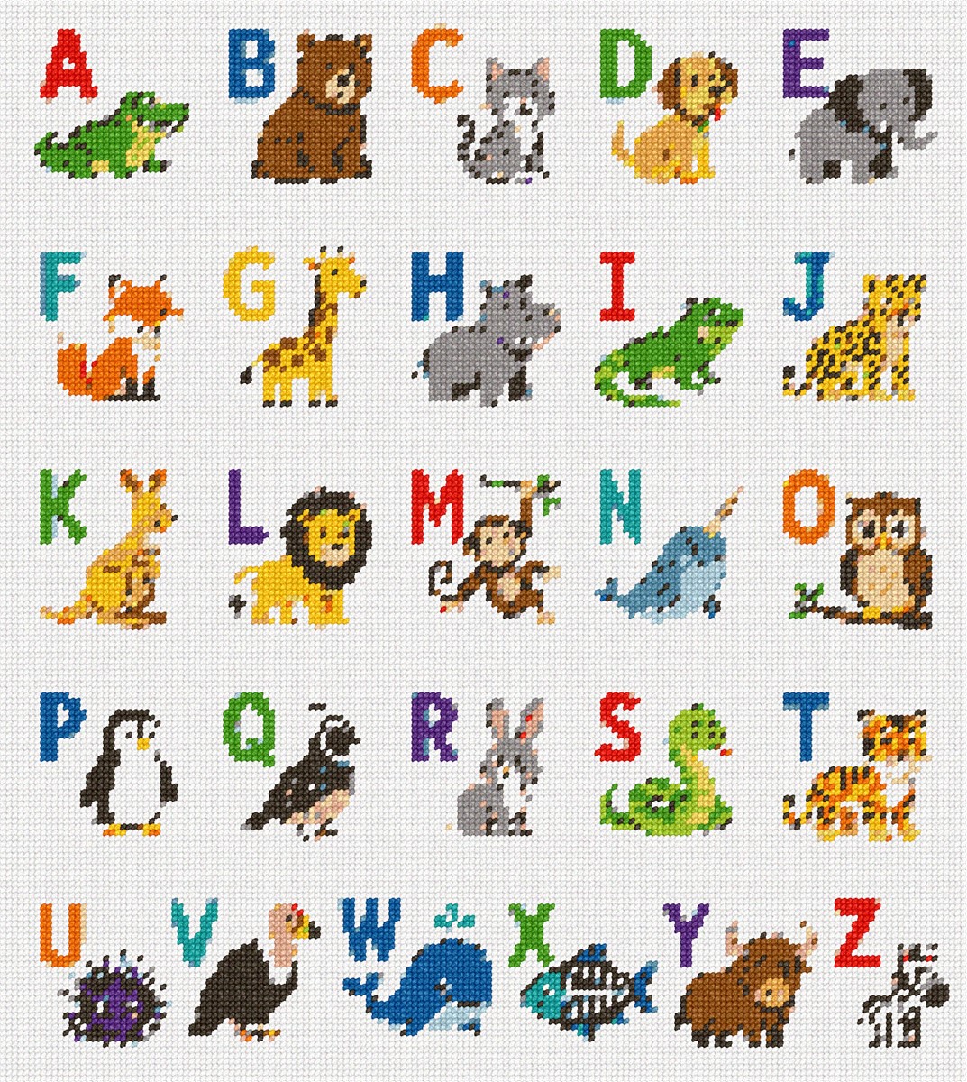 Explore an enchanting alphabet design featuring adorable animals from A to Z, each paired with a vibrant letter in lively, engaging colors. The playful illustrations use a diverse color palette that exudes a cheerful and educational mood, perfect for sparking joy in any child's room. Distinctive details include the unique portrayal of each animal, adding charm and individuality to every letter-image pairing.