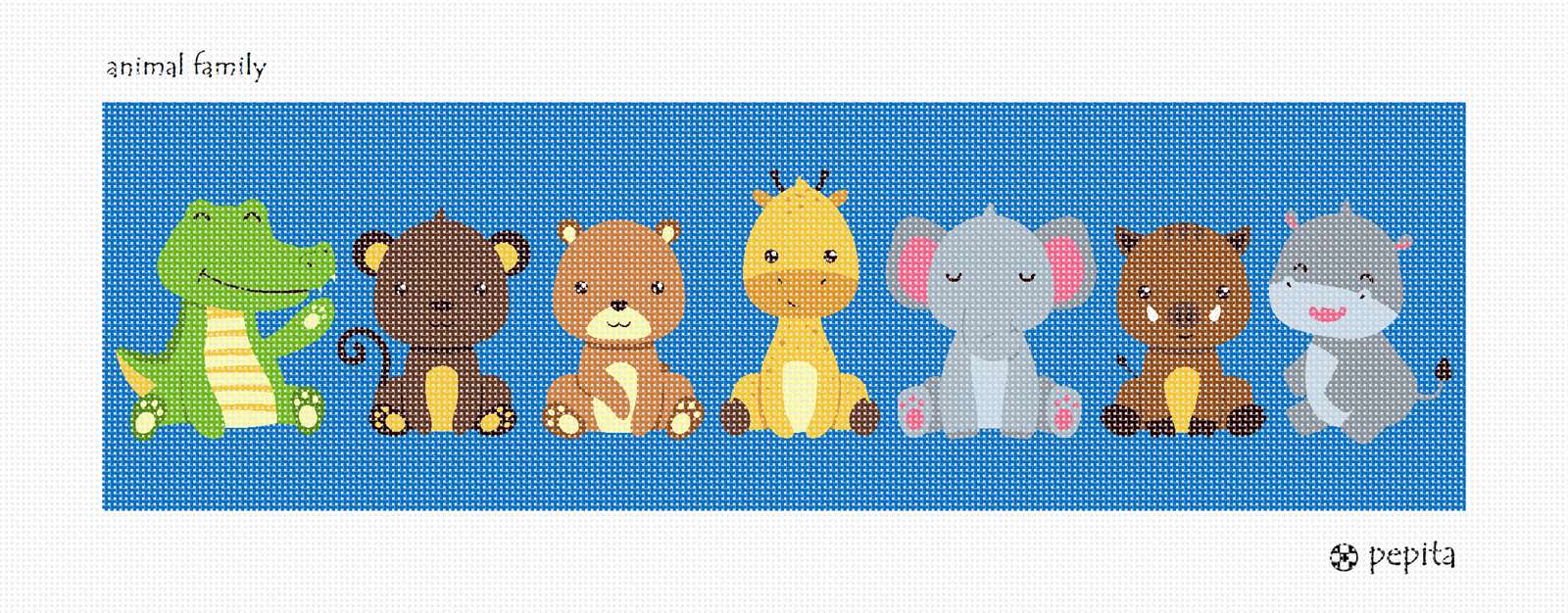 A row of adorable baby animals for baby nursery decor. This will also look great finished as a pillow. Some animals featured are a monkey, alligator, hippo, and an elephant.