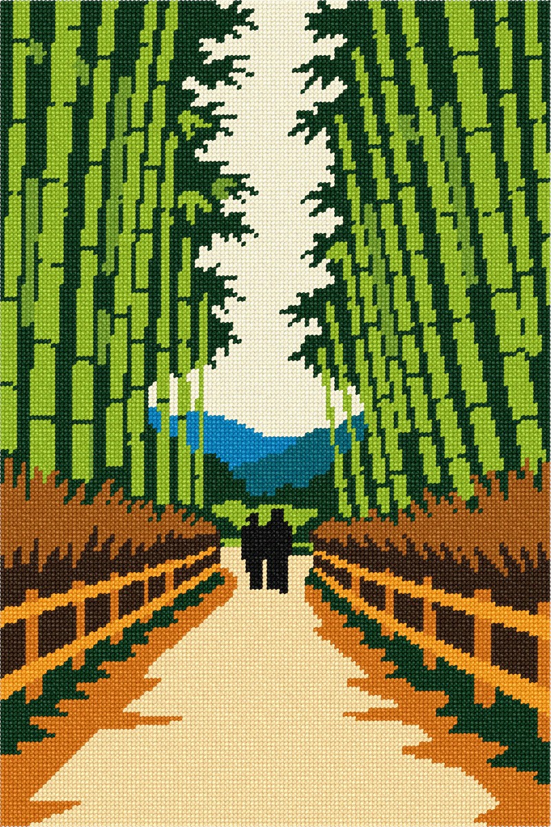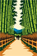 Arashiyama Bamboo Grove captures a serene path flanked by towering bamboo, drawing the eye towards distant blue mountains. The lush greens and warm earth tones create a tranquil and harmonious atmosphere. The linear perspective and balanced composition invite viewers to explore this peaceful landscape visually.