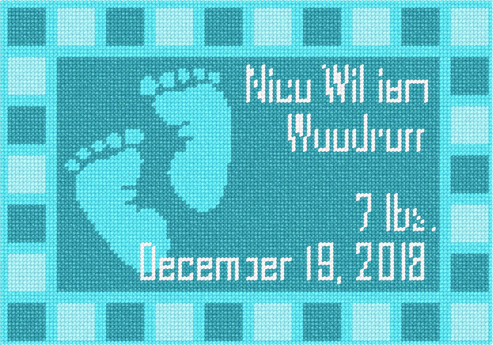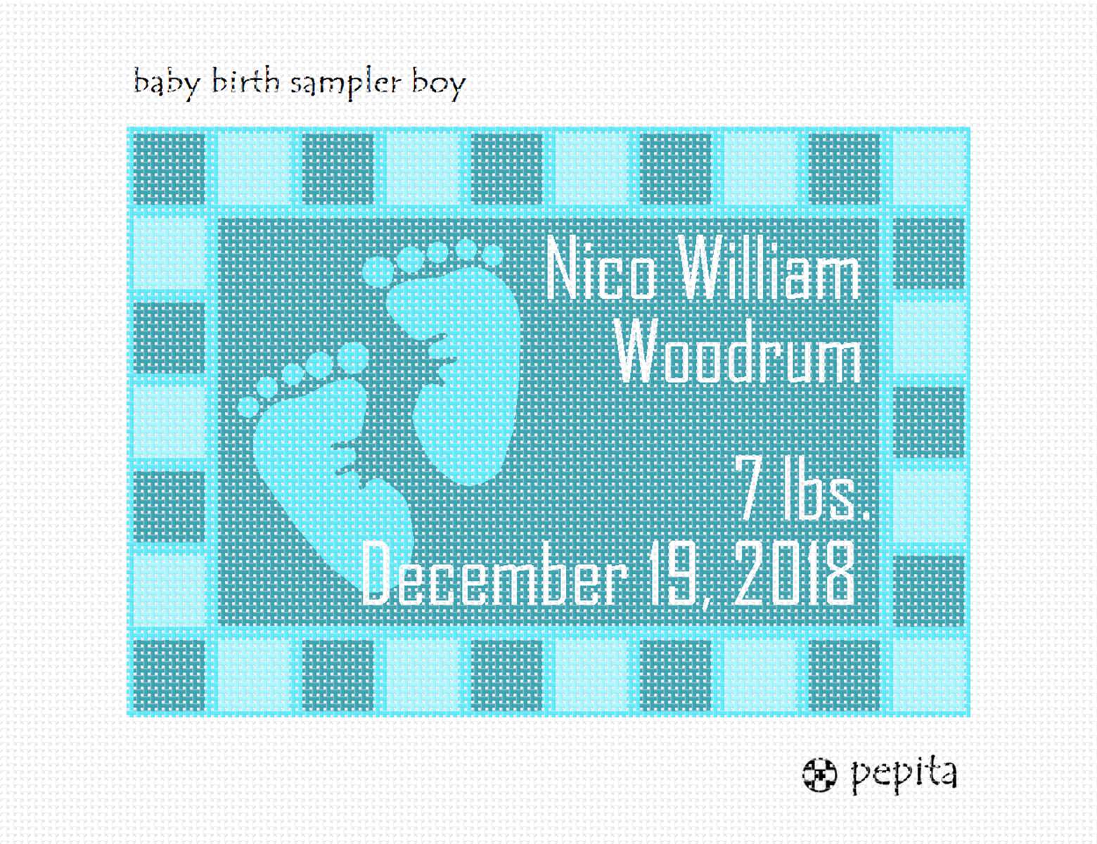 Customize a baby boy birth announcement in needlepoint. Baby birth samplers with the baby's name, date of birth, and birth weight are a popular needlepoint item. The tiny footprints are reminiscent of newborns when their footprints were stamped and preserved on archival paper. Do they still do that today?