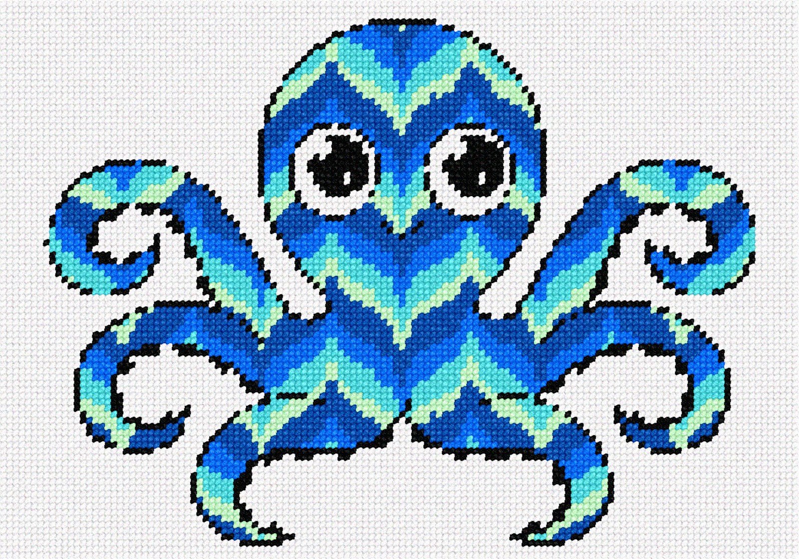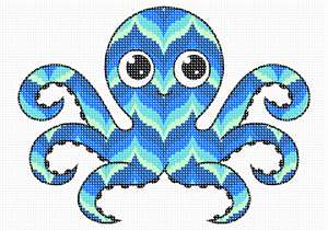 A friendly octopus in popular bargello pattern. This needlepoint is perfect for baby nursery decor. Octopus arms have a mind of their own. They have three hearts and their blood is blue. They are masters at camoflouge. They can walk as well as swim and can even regrow a lost arm! These are intelligent sea creatures that are fascinating.