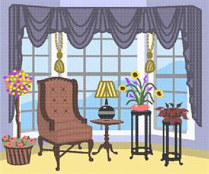 A sunlit room with decorated windows, comfortable chair, planters and side table. This design coordinates with others in our Home Sweet Home series. A house is made of walls and beams, a home is built with love and dreams. ...