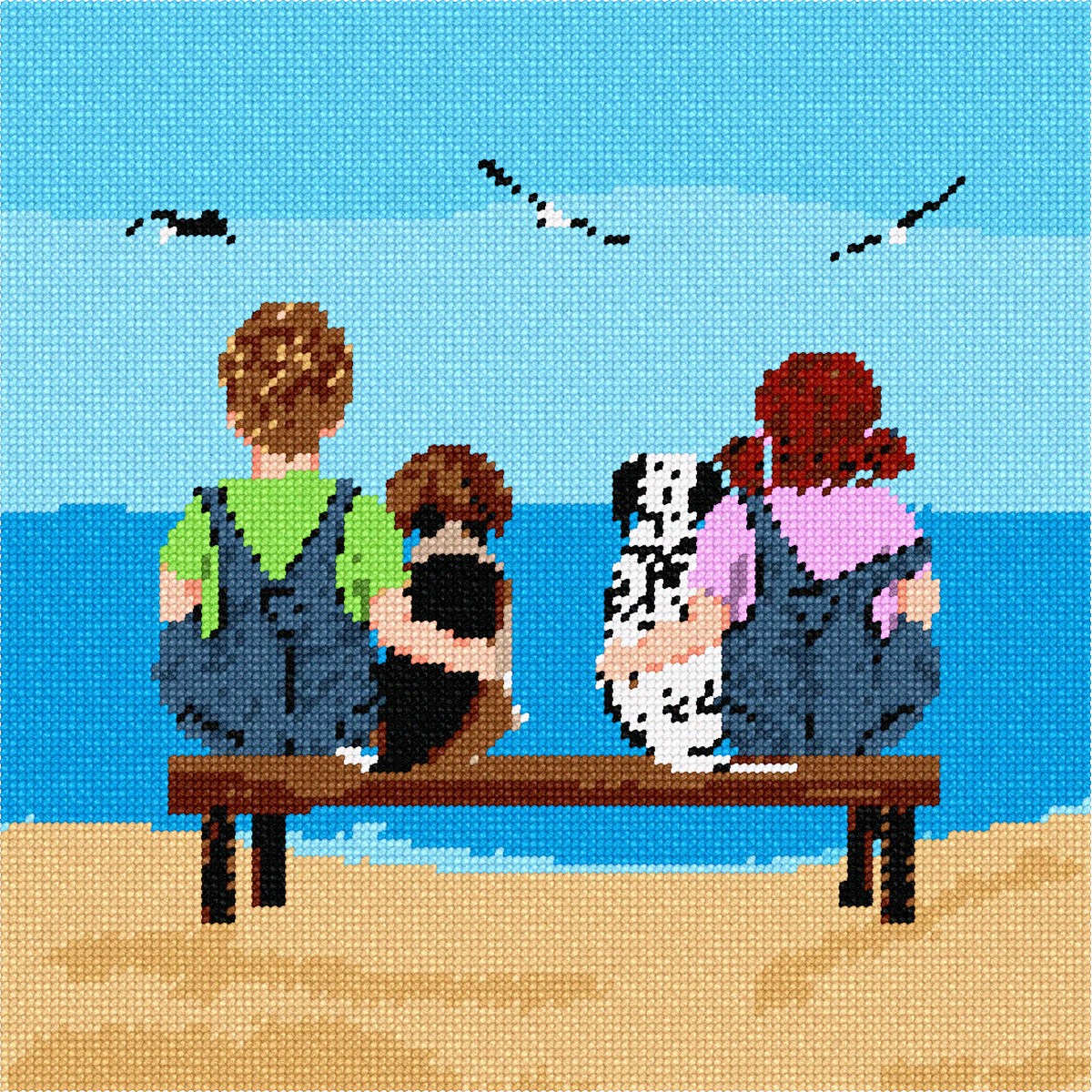 Oh, those innocent days of childhood. This nostalgic design takes you back in time... This is part of a series. A Dalmatian and Beagle Puppy watch the birds flying over the ocean with their beloved owners.
