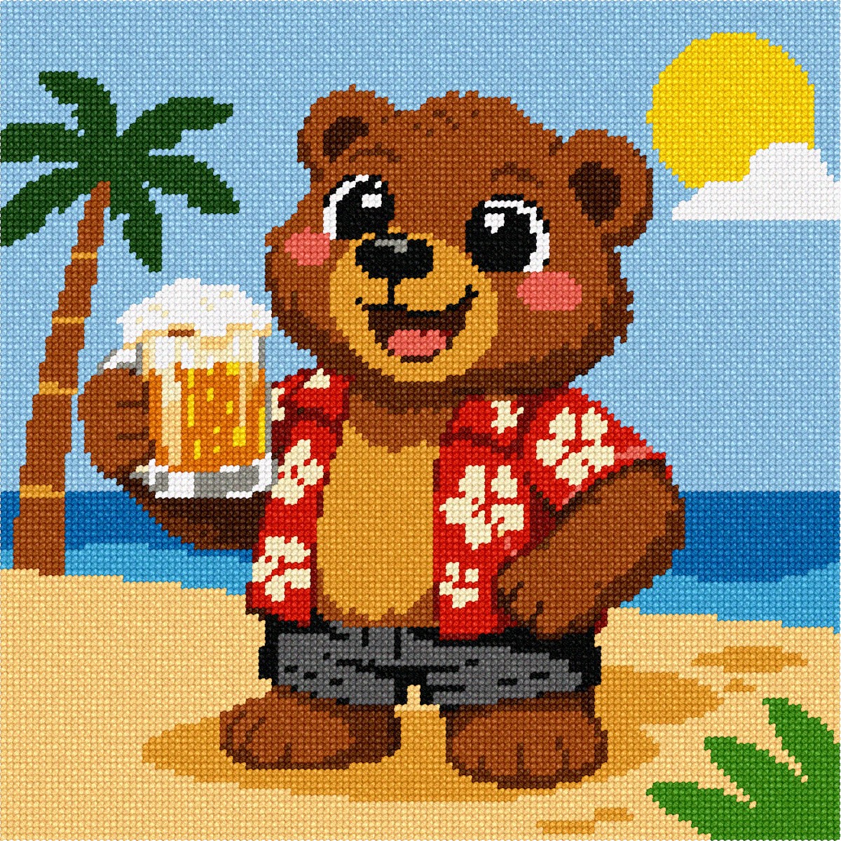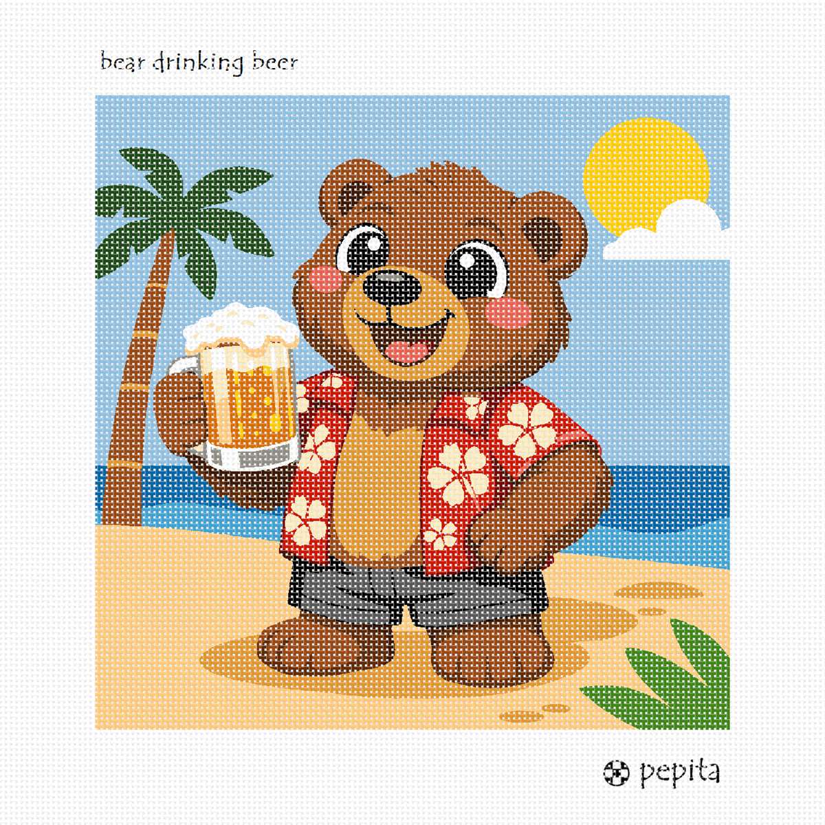 A play on words. This bear is enjoying a beer! See the moose eating mousse, the croc wearing crocs, the hare getting her hair done, and the elephant in trunks. Adorable easy needlepoint projects.