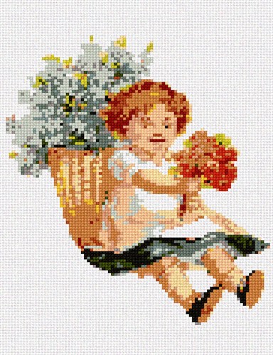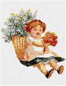 Backed by an imposing basket of blue vibrant flowers, little Betsy offers a passerby a small bunch of pretty flowers. Based on vintage artwork.