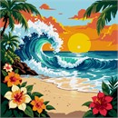 Tropical flowers and palm trees on this magical beach with a large wave coming in. Beautiful sky with a lovely sun.