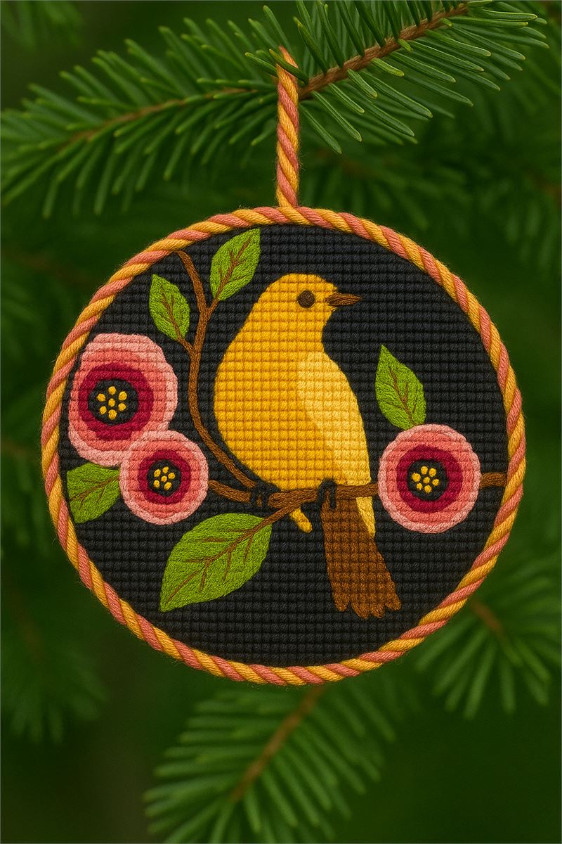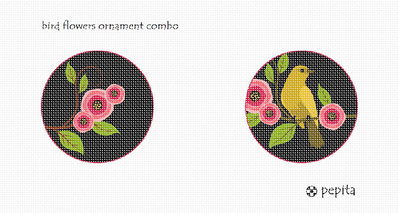 New! Pepita now designs ornaments. These are paired and sold as a set. This one has a golden bird with flowers and a coordinating flower ornament. Stitch two for the price of one. 18 mesh