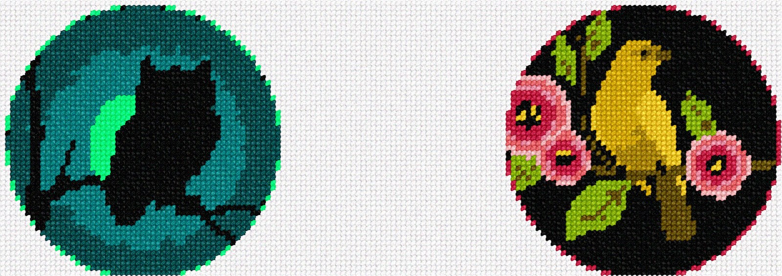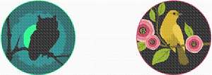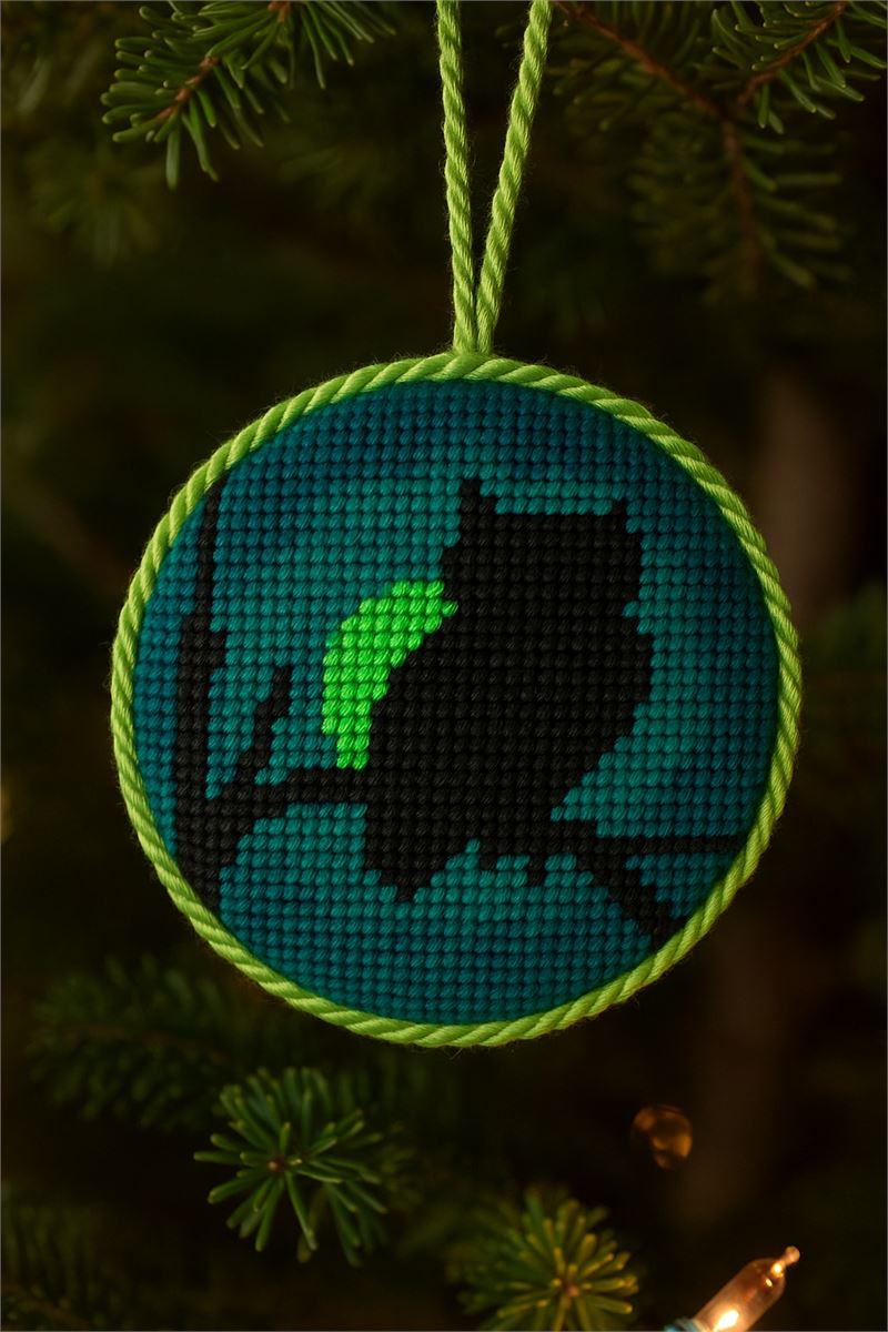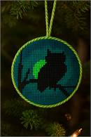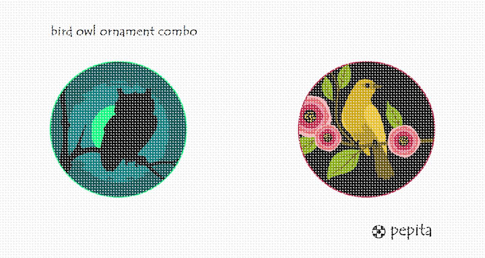 New! Pepita now designs ornaments. These are paired and sold as a set. This one has an owl ornament and a golden bird ornament. Stitch two for the price of one. 18 mesh