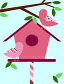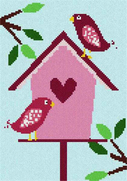 A lovely birdhouse with branches and leaves in heart themes and colors.