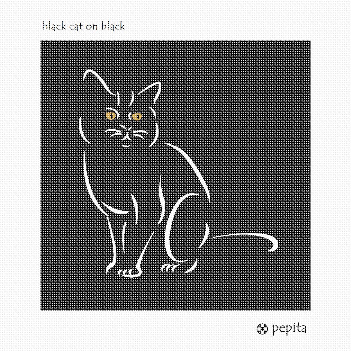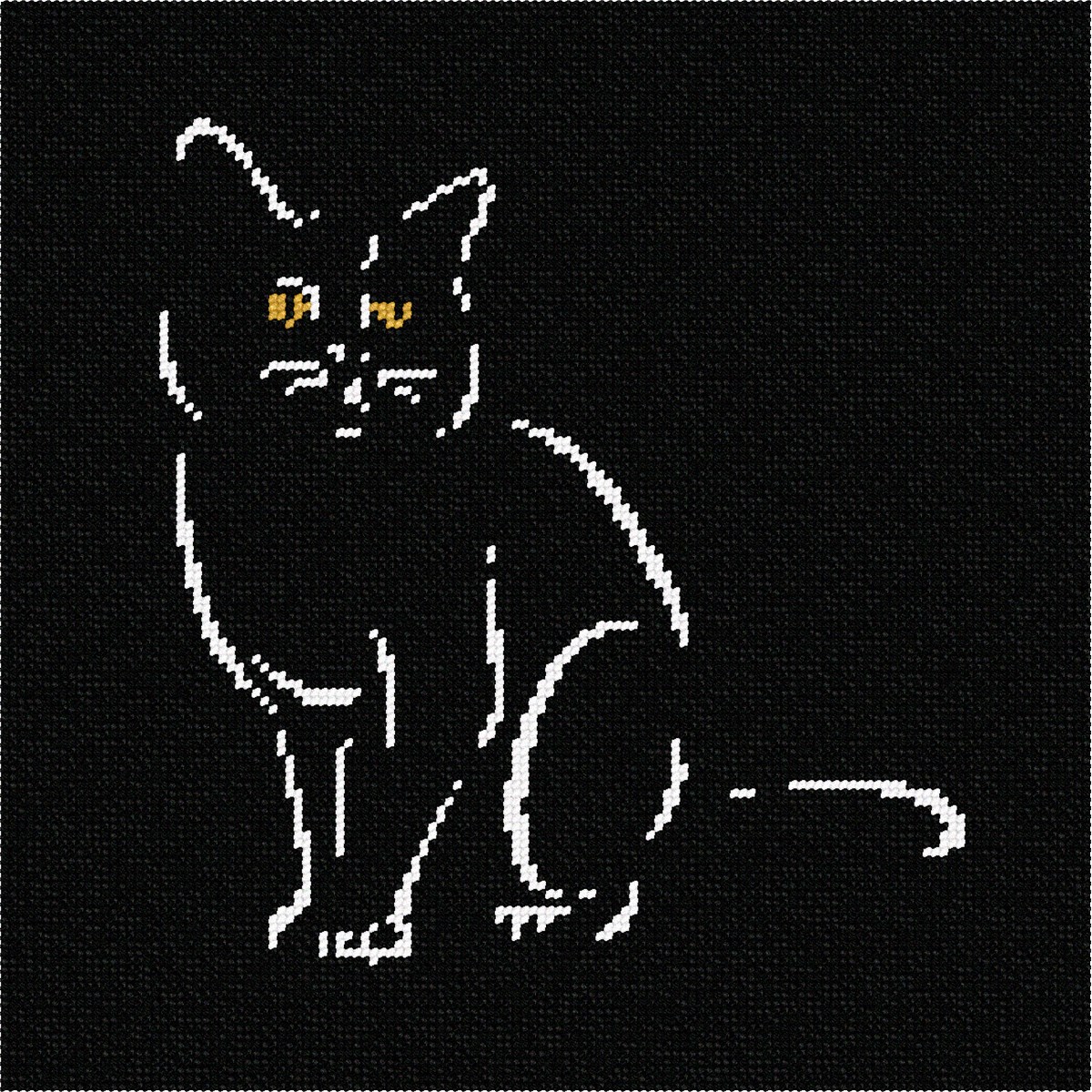 The black cat is considered to bring good luck in many cultures. Black is a common color for felines. Everyone seems to know someone who has one. This needlepoint is a caricature of a black cat with golden yellow eyes.
