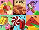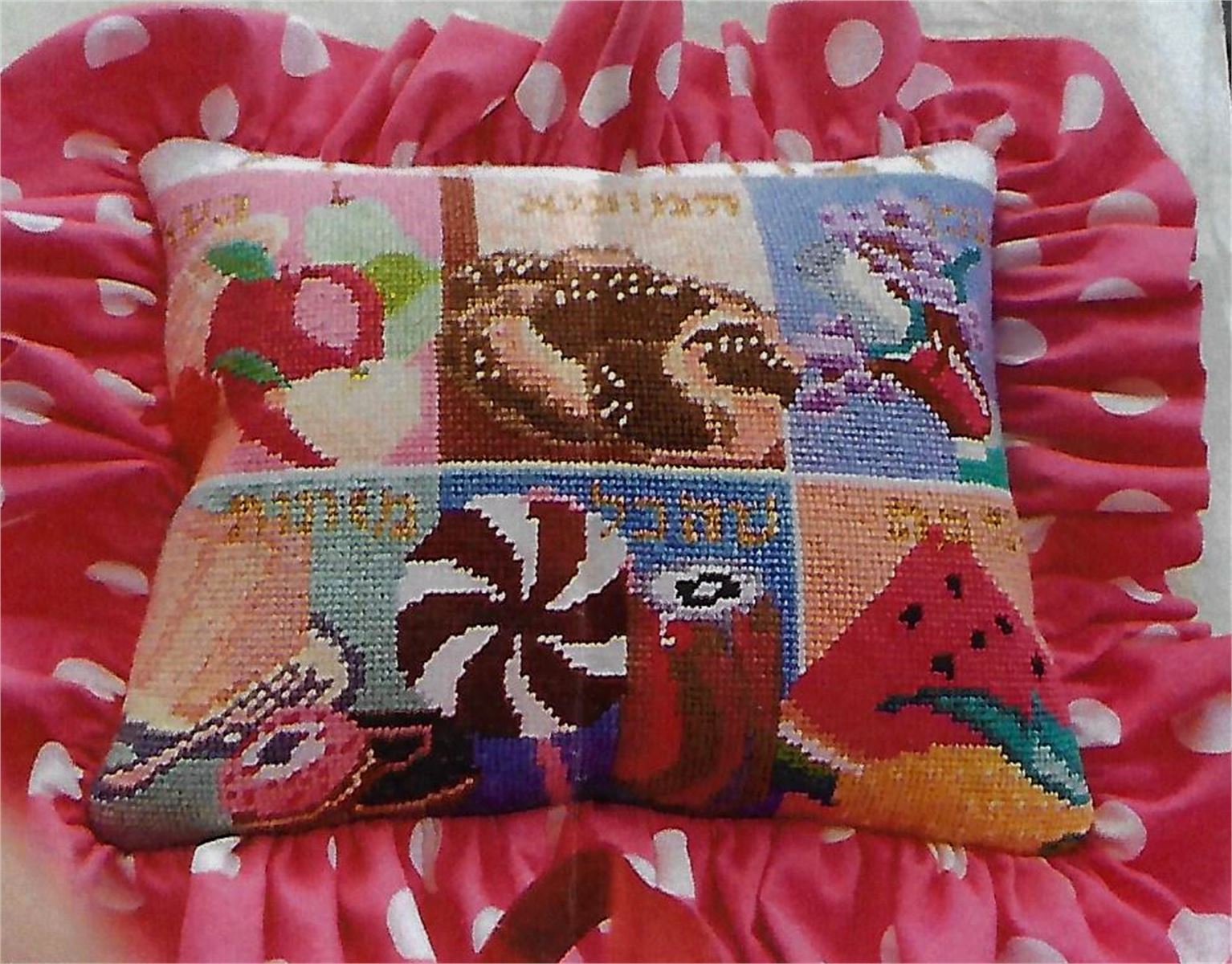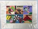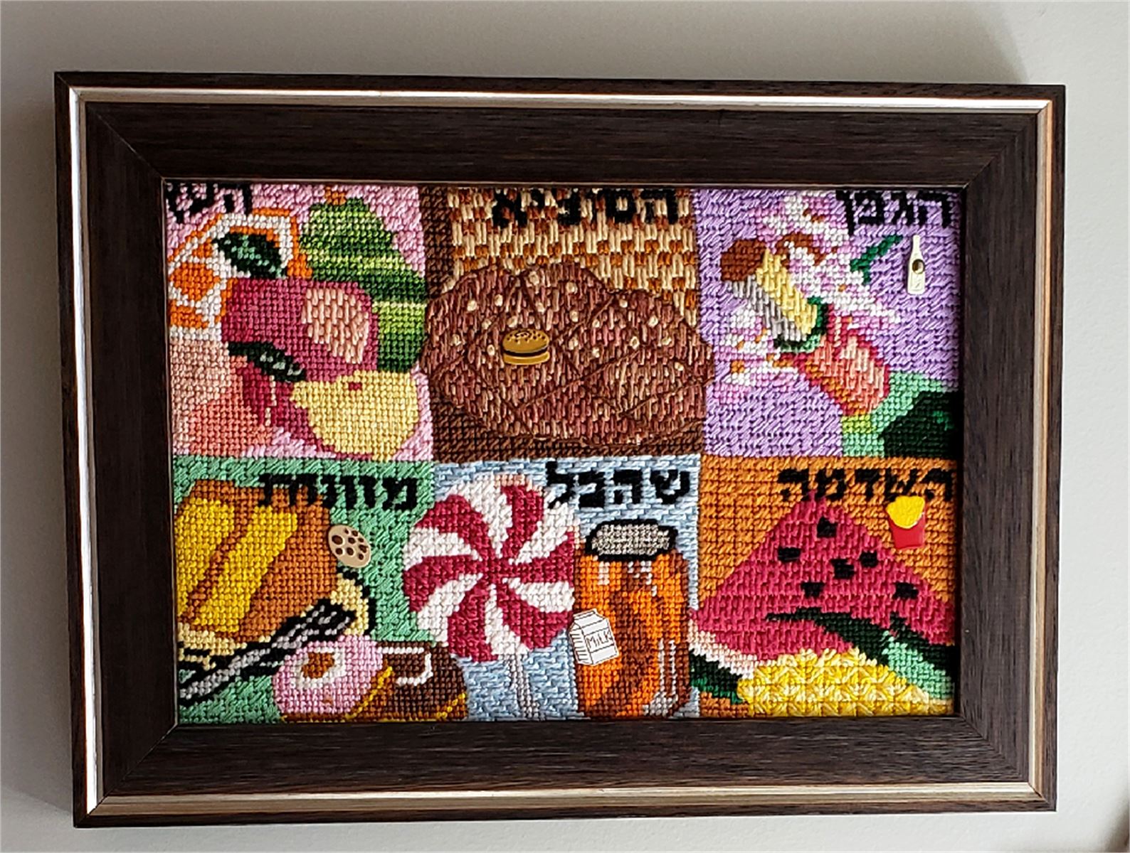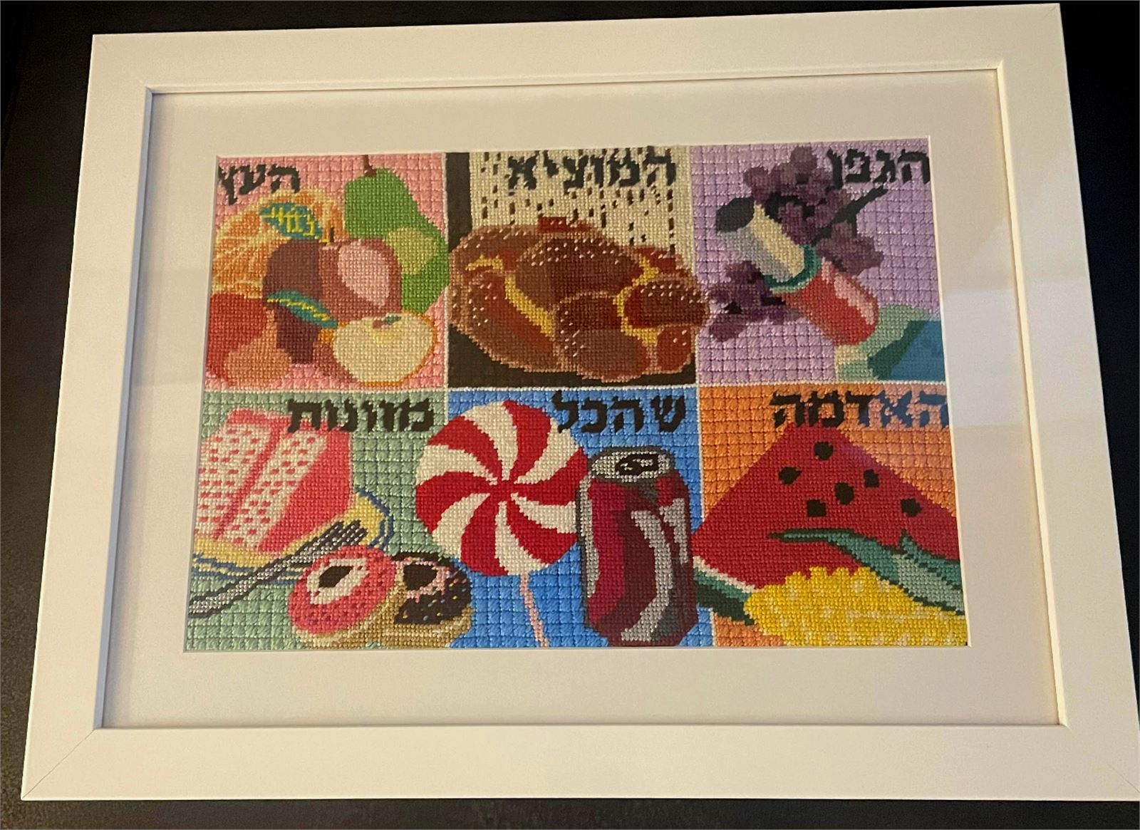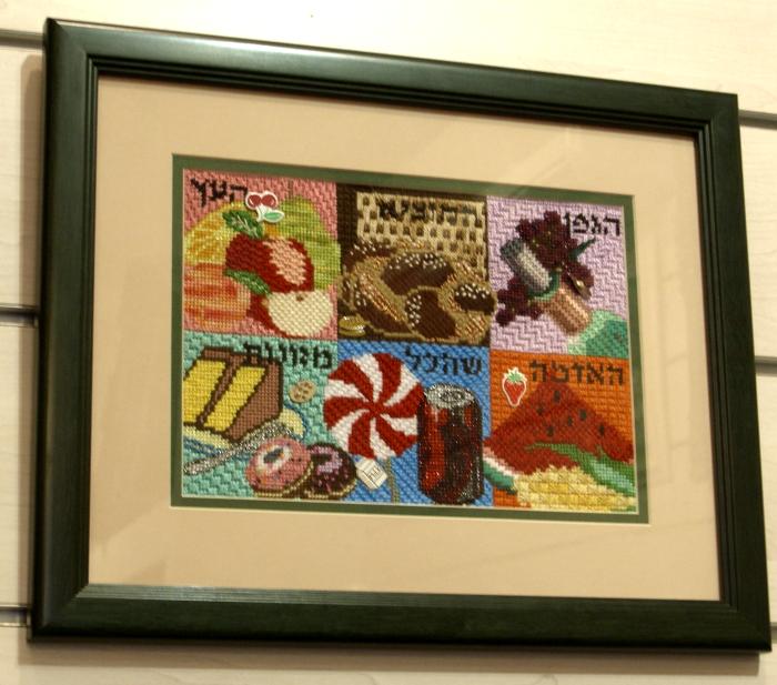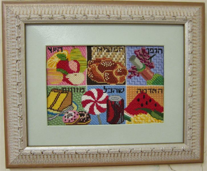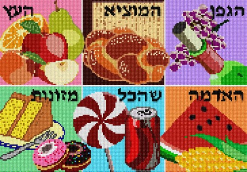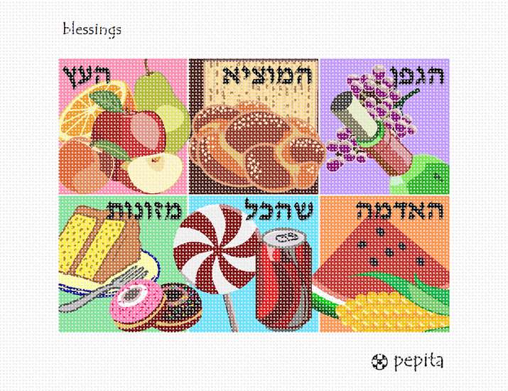 A mouth-watering needlepoint canvas featuring six different blessings and the foods upon which they are made. Pictured in six colorful panels, clockwise from upper left: "Ha'etz", for fruits that grow on trees; "Hamotzi", for bread and matzo; "Hagafen", for wine; "Ha'adama", for fruits of the ground; "Shehakol", for foods not in any of the other categories; and "Mezonos", for food made from grain.