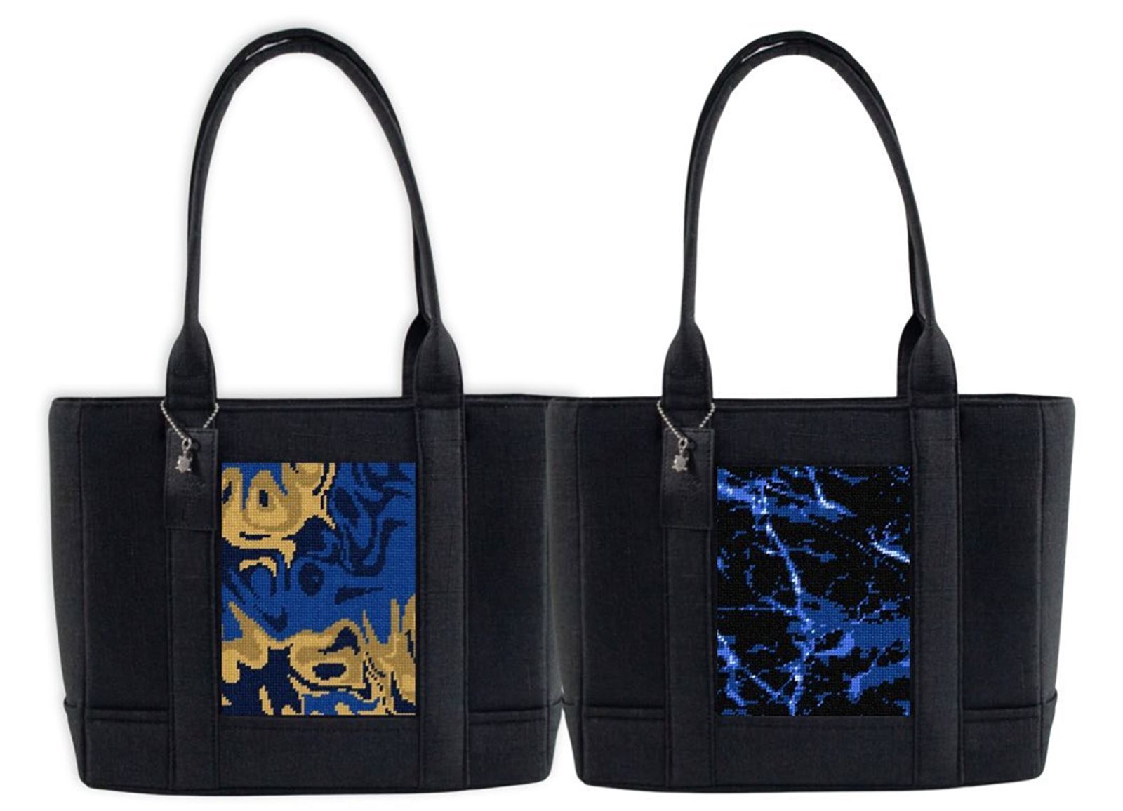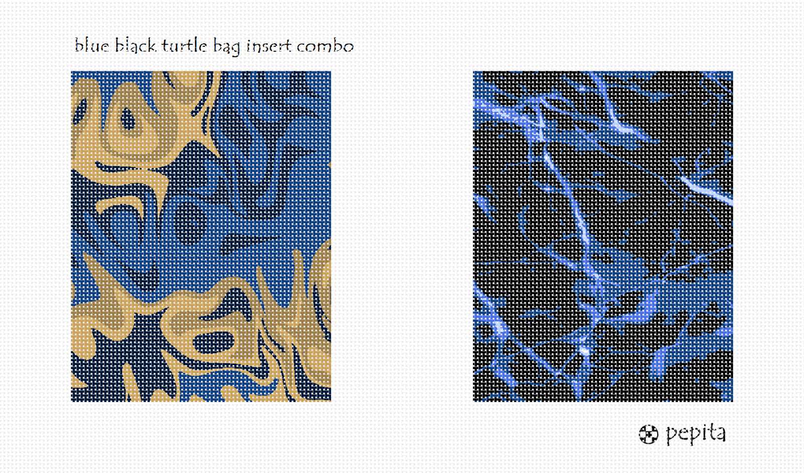 Stitch a shell for your new turtle bag. Turtle bags are tote bags that come with a window for interchangeable designs. This set has two designs to match a black or blue denim turtle bag. Stitch them both and switch off the inserts. Save money by purchasing a combo. These needlepoints can also be stitched as regular projects. They measure 5.5 X 7, so adjust the stitching area to 5 X 7 and frame with a ready made frame. This combo has a modern art design and a marble one.