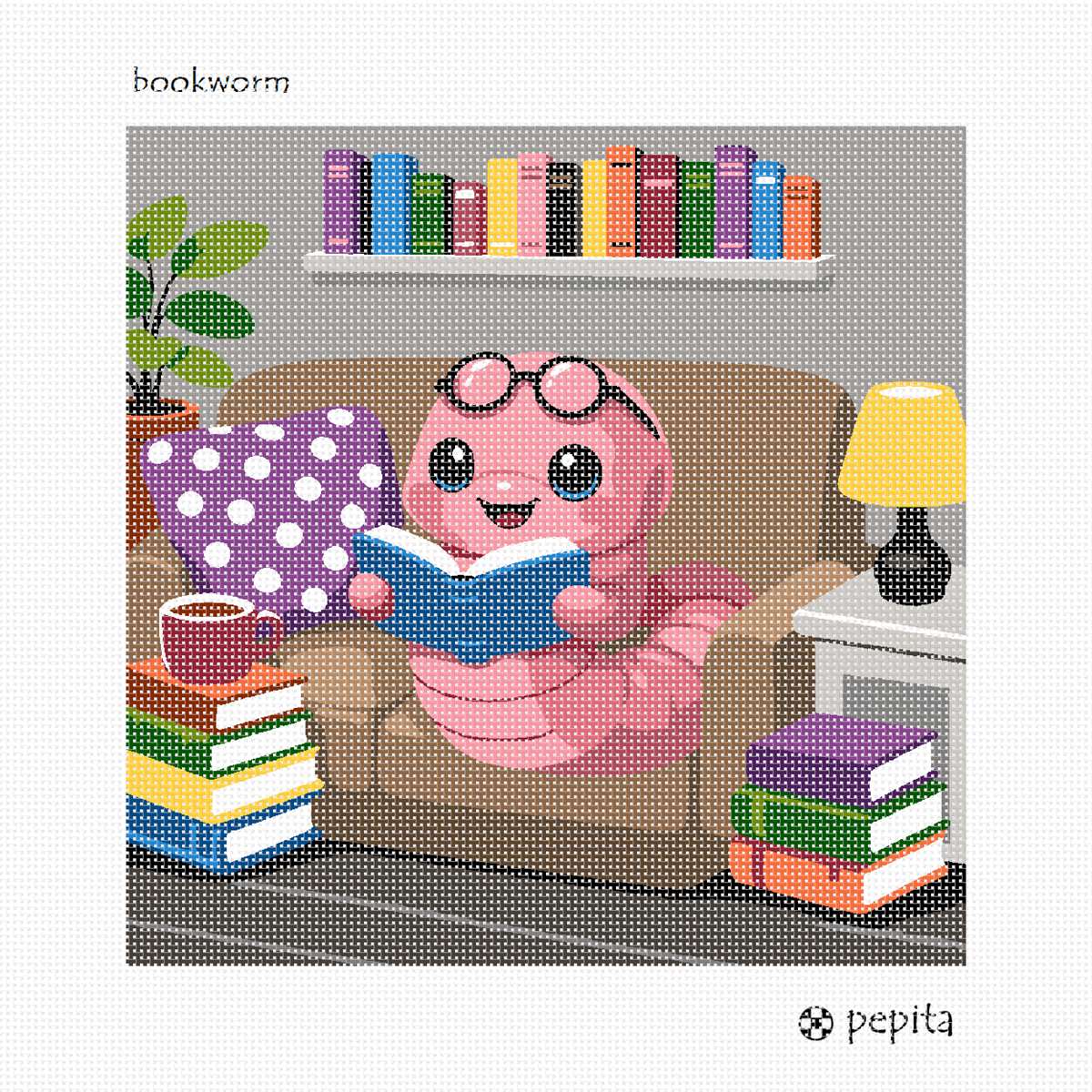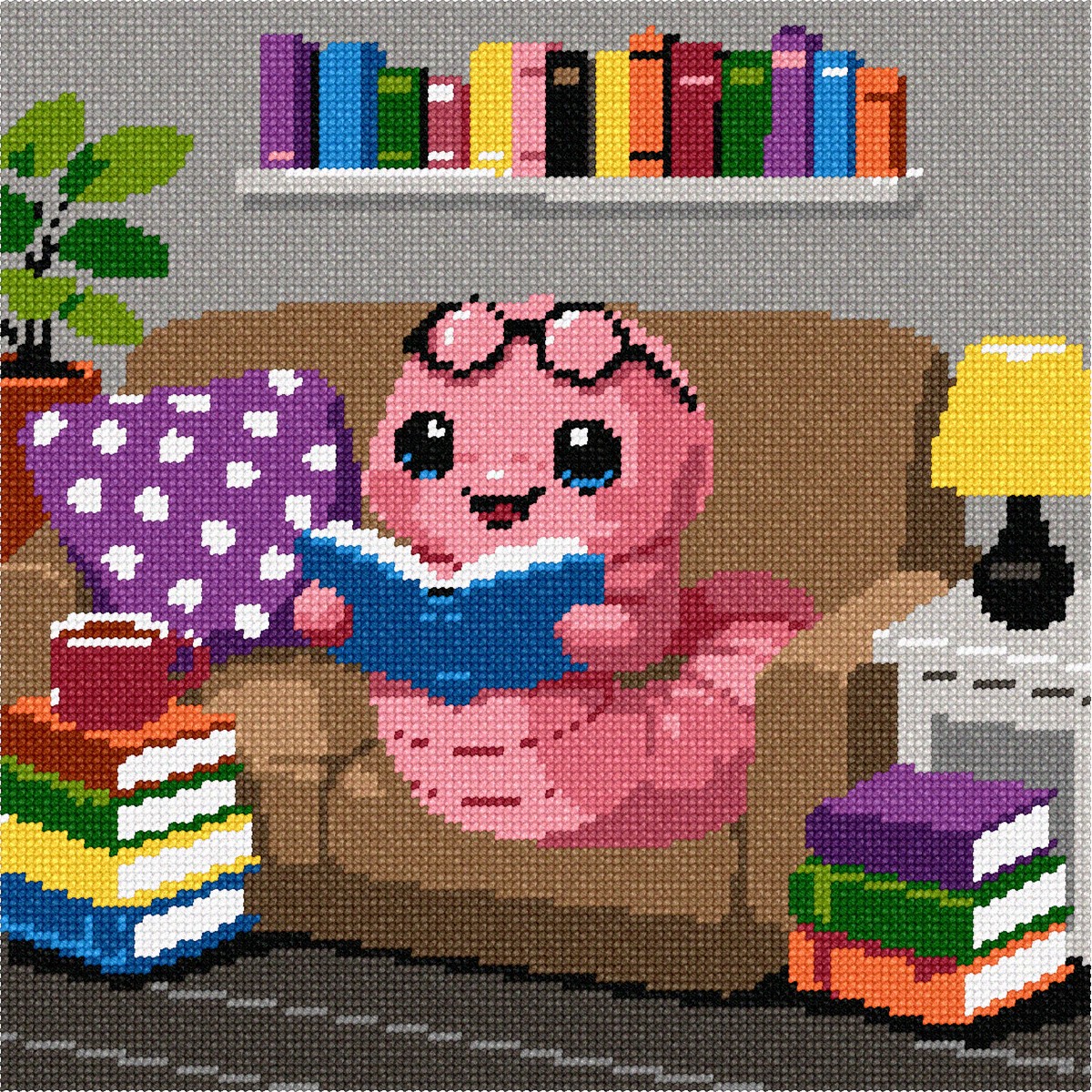 A playful, pink bookworm wearing glasses is the focal point, surrounded by stacks of colorful books in a cozy living room setting. The vibrant palette of pinks, purples, greens, and yellows creates a cheerful and inviting atmosphere. The whimsical composition, featuring a polka dot pillow and a warm lamp glow, adds a charming, relaxed vibe to the scene. Perfect gift for someone who loves to needlepoint and read.