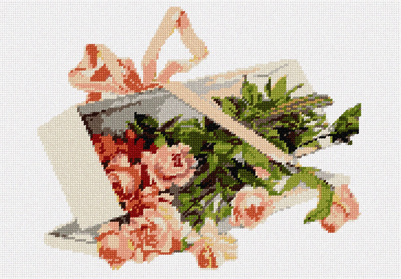 A red-ribboned box overflows with roses, and boy do they look thirsty! Water these flowers with soft pastel colors and hang in indirect sunlight. Based on vintage artwork.