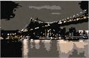 A bridge lights up the night sky with bright lights. An array of colors form the magnificent reflection in the water.