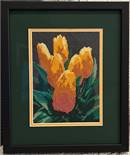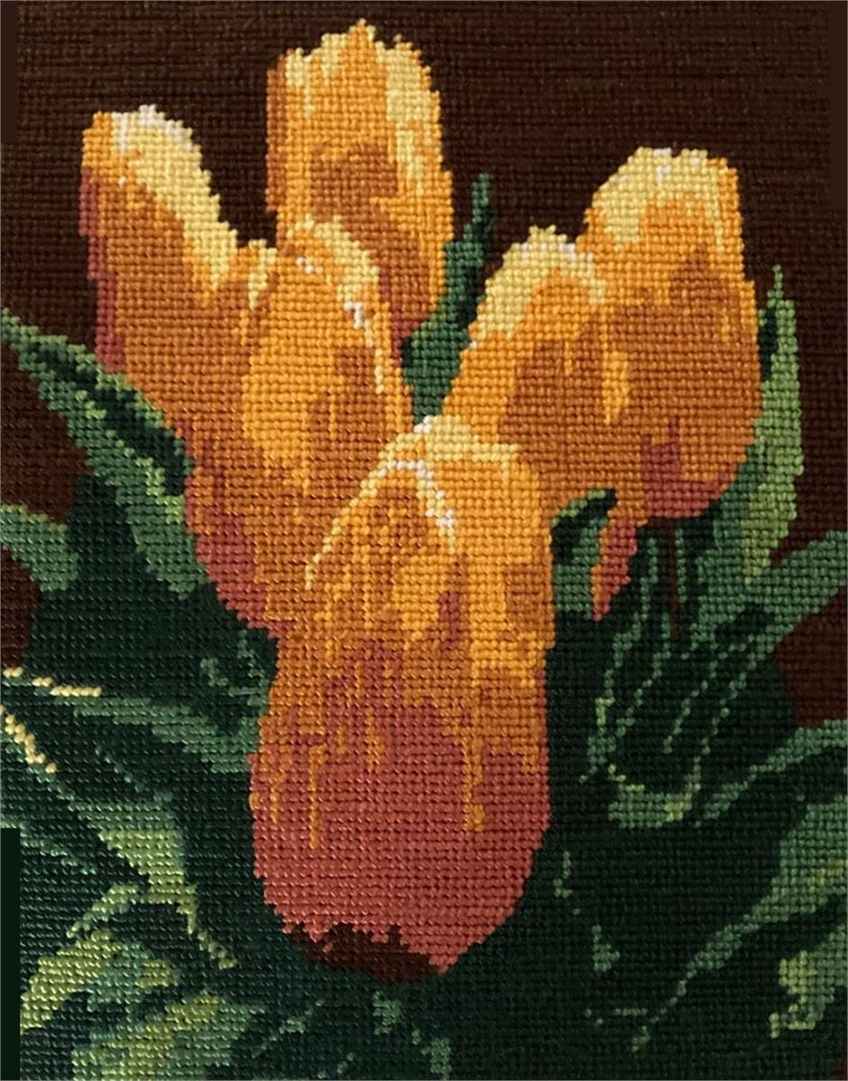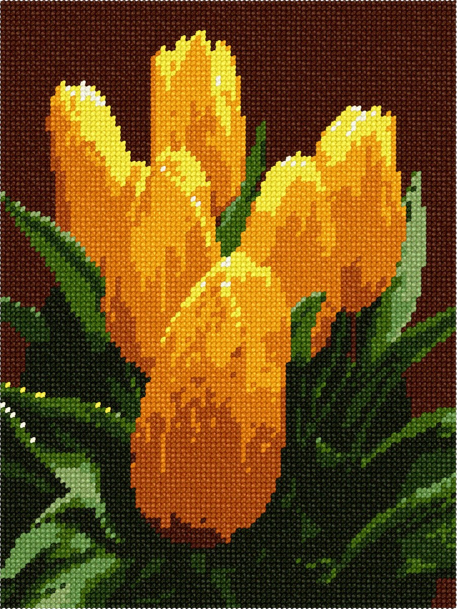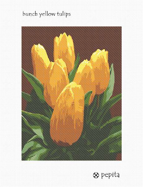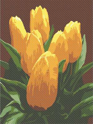 Six yellow tulips, in wonderfully contrasting natural colors. Real live tulips bloom once a year. Tulip needlepoints can be enjoyed throughout the year. Red tulips are most strongly associated with true love, while purple symbolizes royalty. The meaning of yellow tulips has evolved somewhat, from once representing hopeless love to now being a common expression for cheerful thoughts and sunshine.