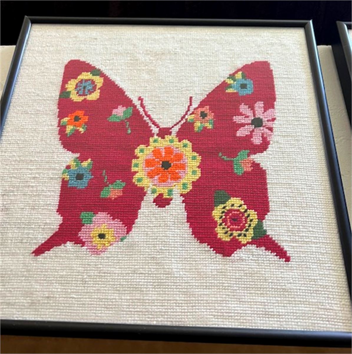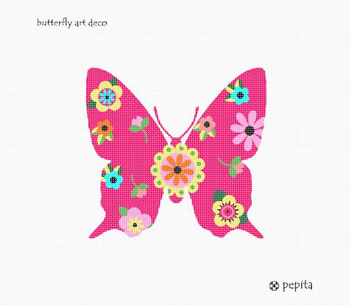Needlepoint a butterfly with a pattern of scattered art flowers throughout. Butterflies are deep and powerful representations of life. Around the world, people view the butterfly as representing endurance, change, hope, and life.