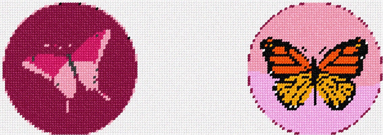 New! Pepita now designs ornaments. These are paired and sold as a set. This one has a simple butterfly ornament and a monarch butterfly ornament. Stitch two for the price of one. 18 mesh