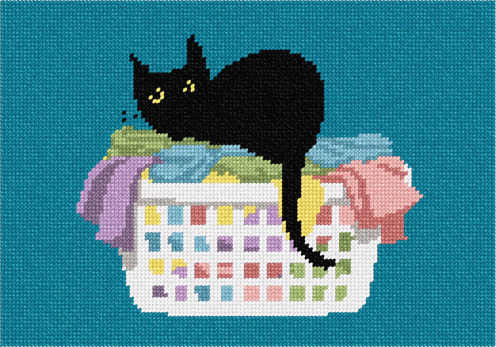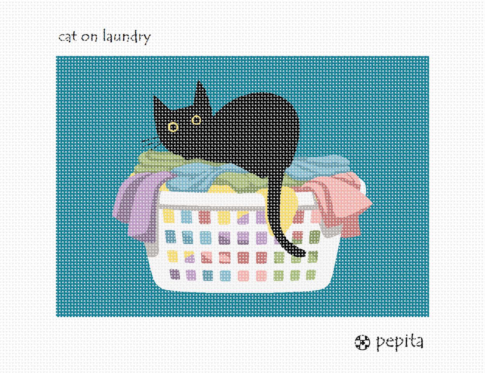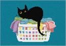 Cats like to sit in cozy laundry baskets. This black cat is comfortable among the towels and and clothes. See coordinating cat designs.