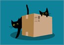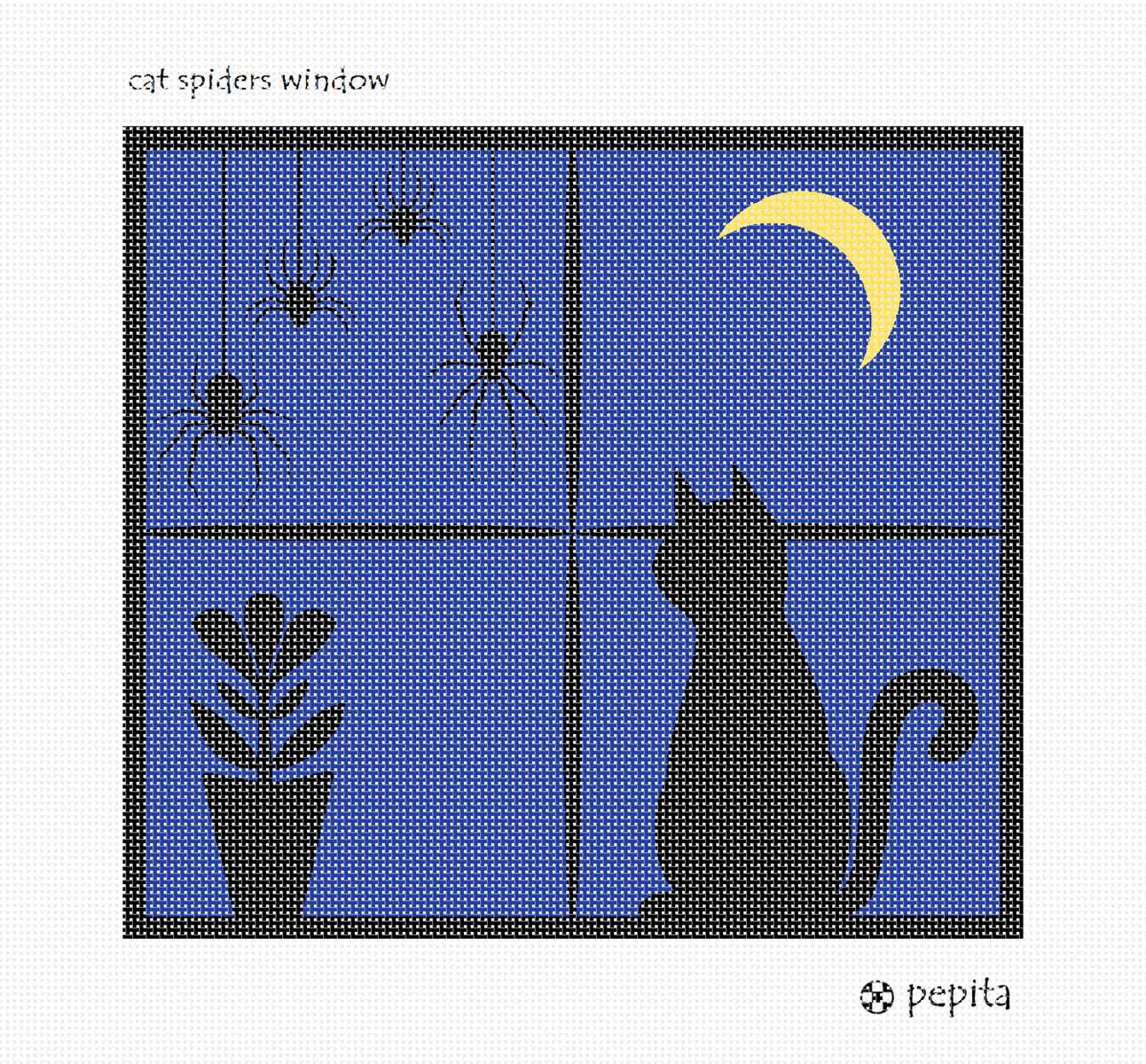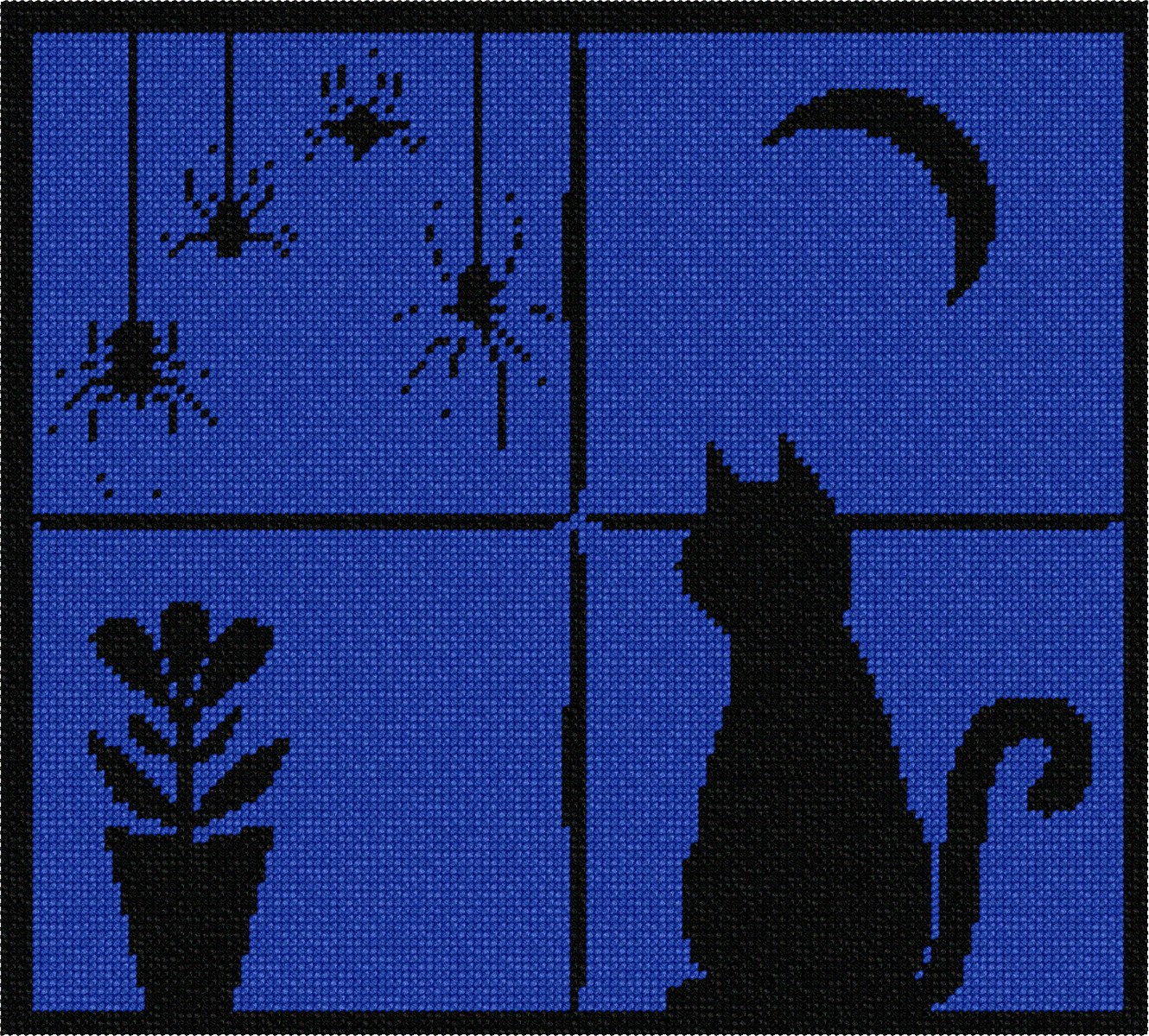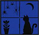 It was a dark and scary night... A black cat is peering out the window. The moon is eerily shining on the silhouette of four creepy spiders dangling from the window pane.