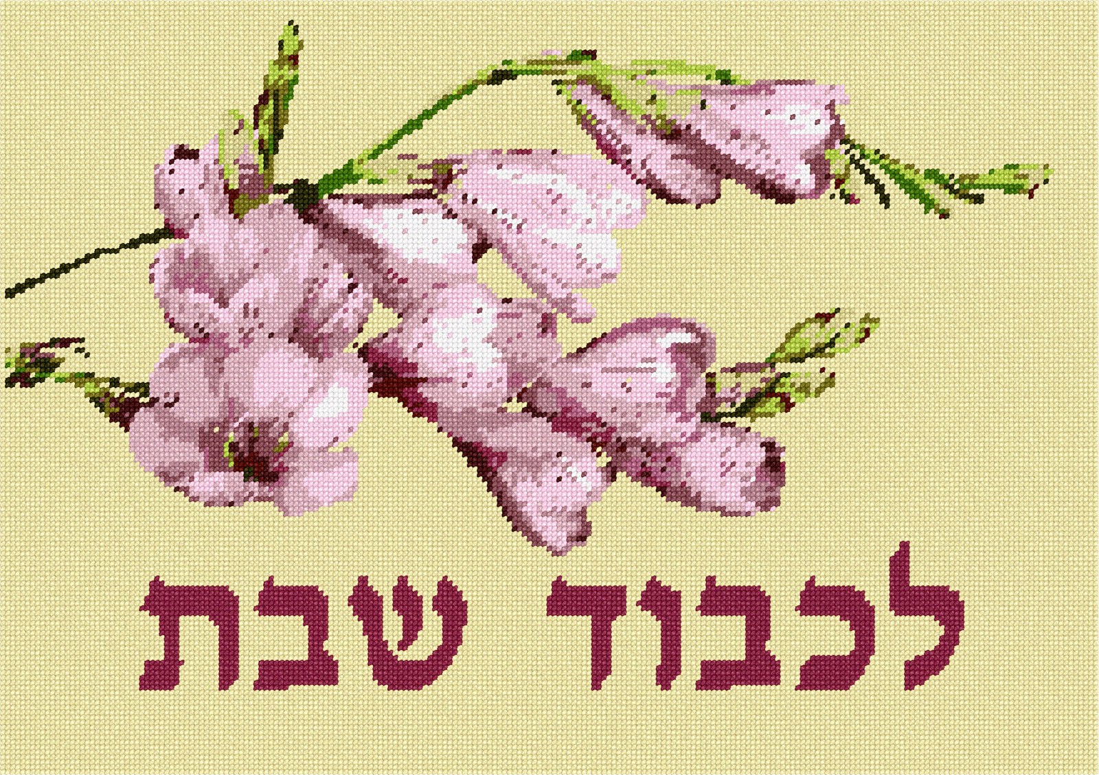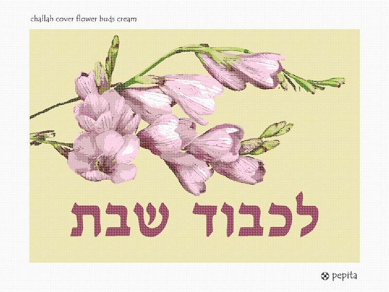 Soft and serene in honor of the Shabbos Queen. Flowers are absolutely stunning! You stitch the front. After it is completely stitched, it is sent to a professional finisher who adds a lining and a fringe or rope border.