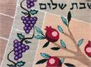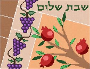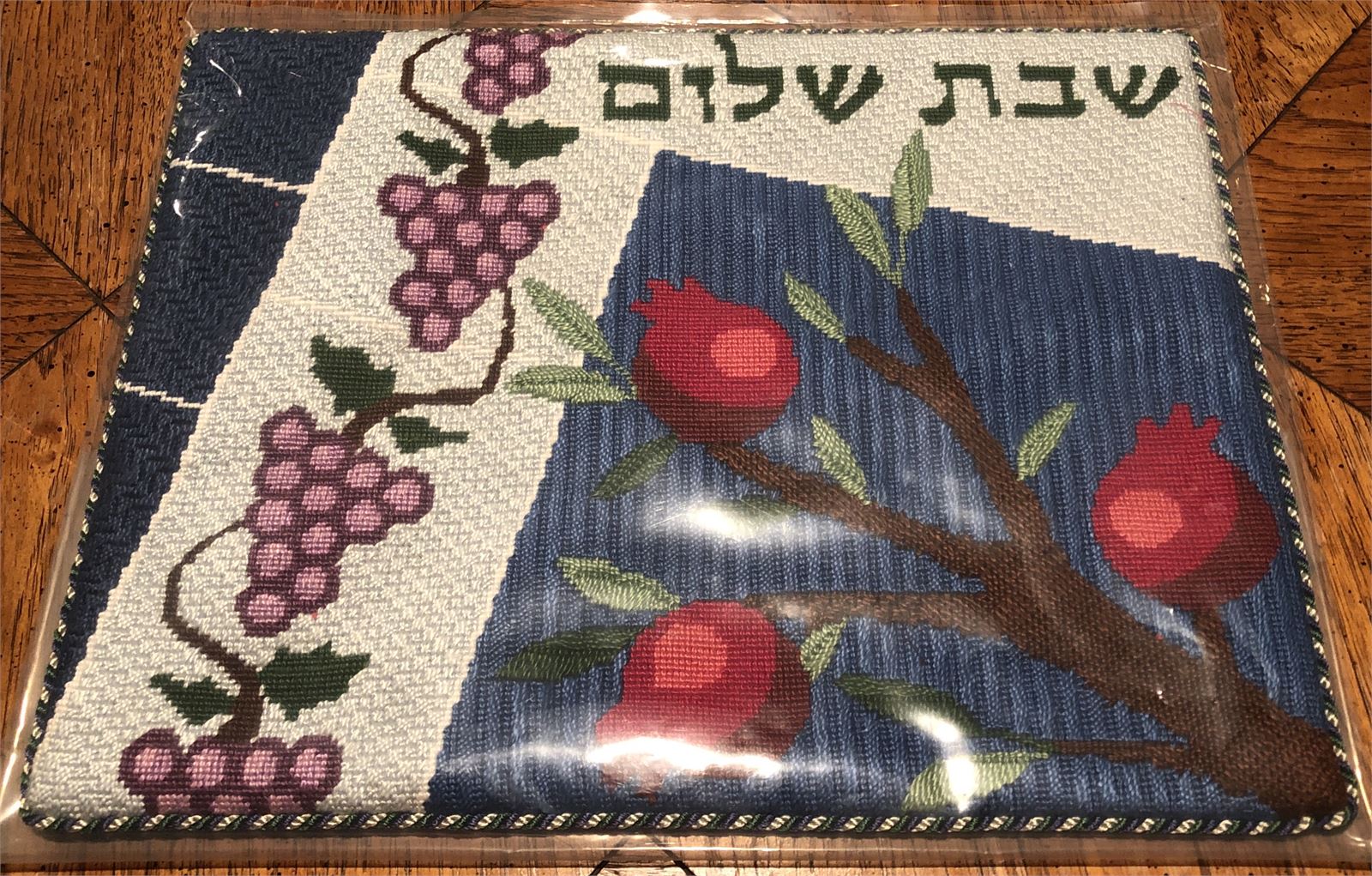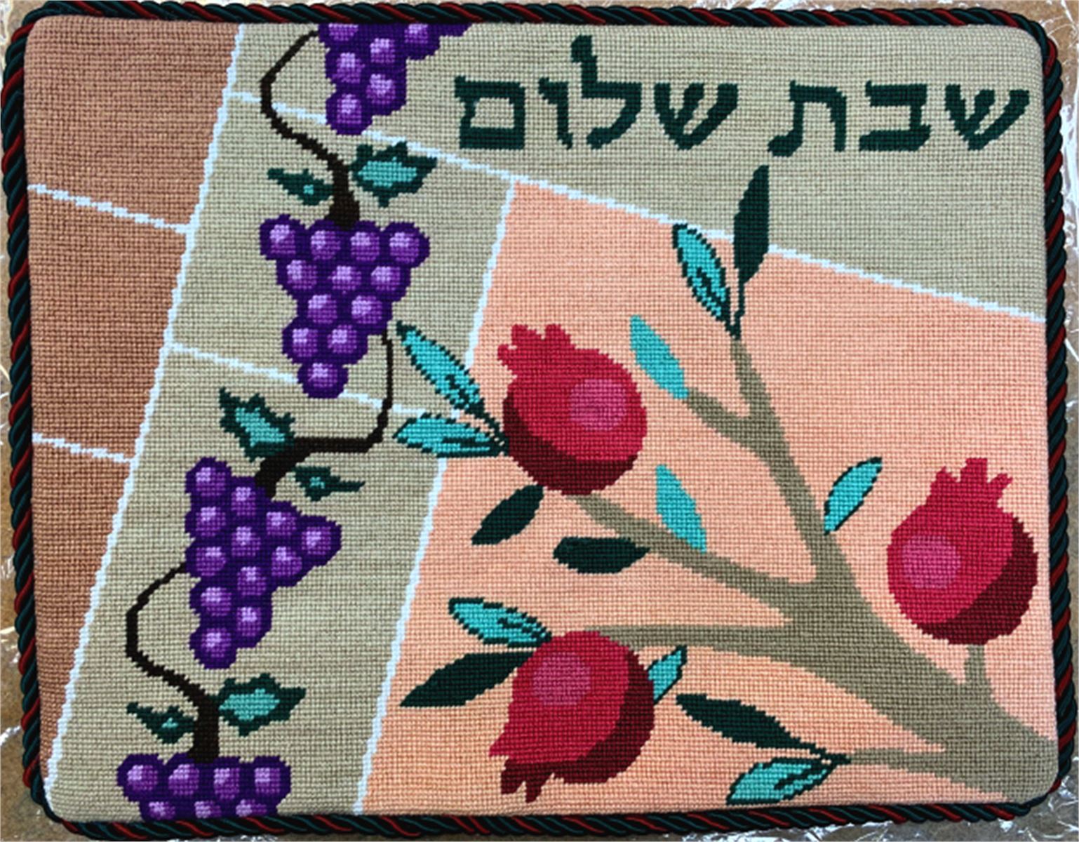 Featuring a grape vine and pomegranate tree, against angled shades of oak. Stitch the front of this fantastic challah cover. Then it is given to a professional finisher who blocks it, sews a lining, and attaches a fringe or rope border edge.