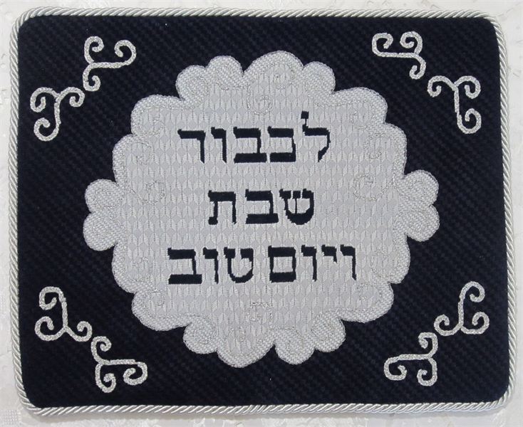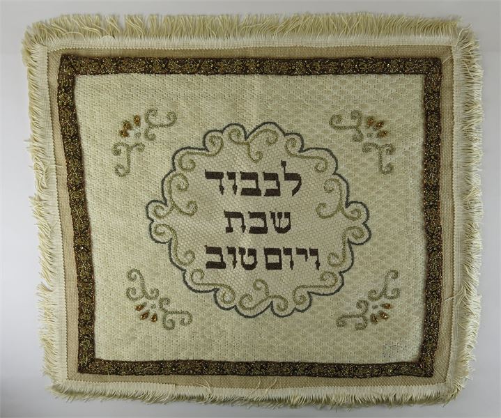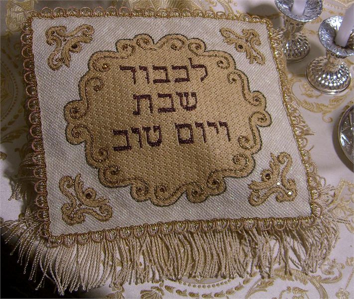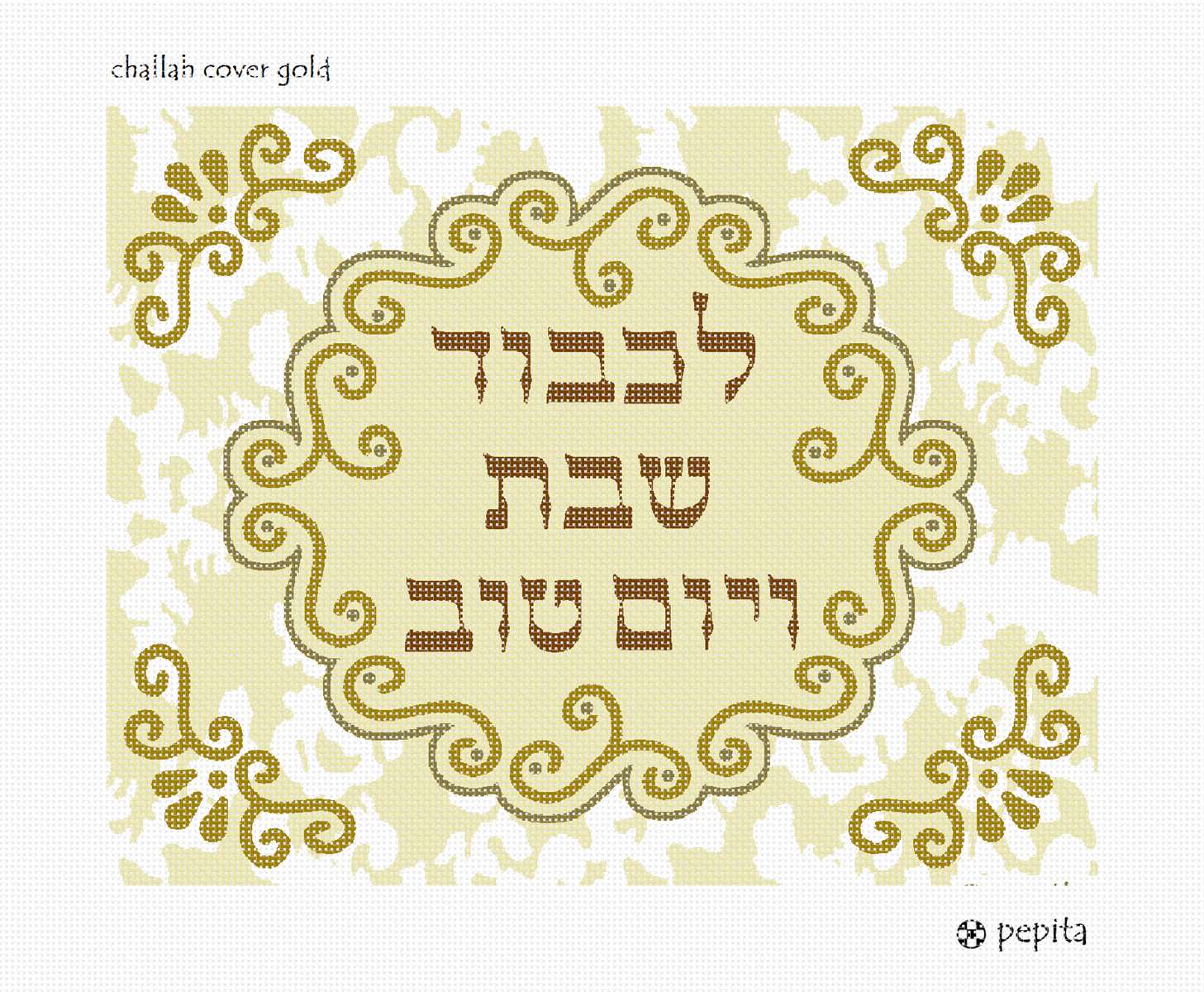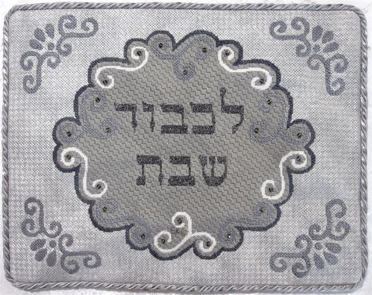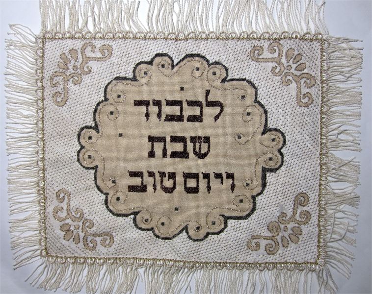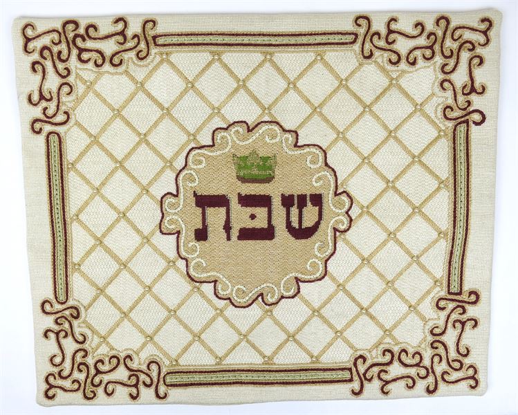 Challah cover with marbleized background, flourish frame, and inset Hebrew lettering. Stitch the front of this fantastic challah cover. Then it is given to a professional finisher who blocks it, sews a lining, and attaches a fringe or rope border edge.