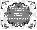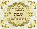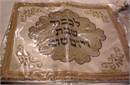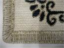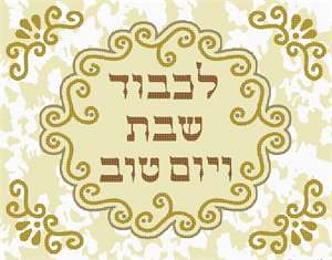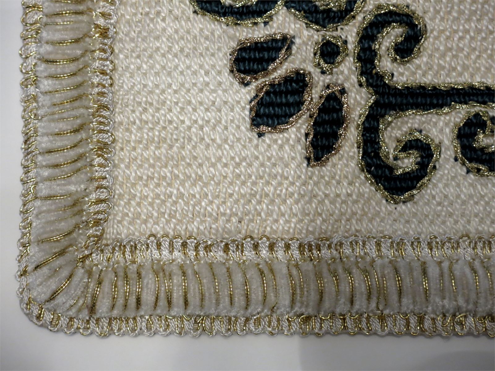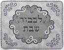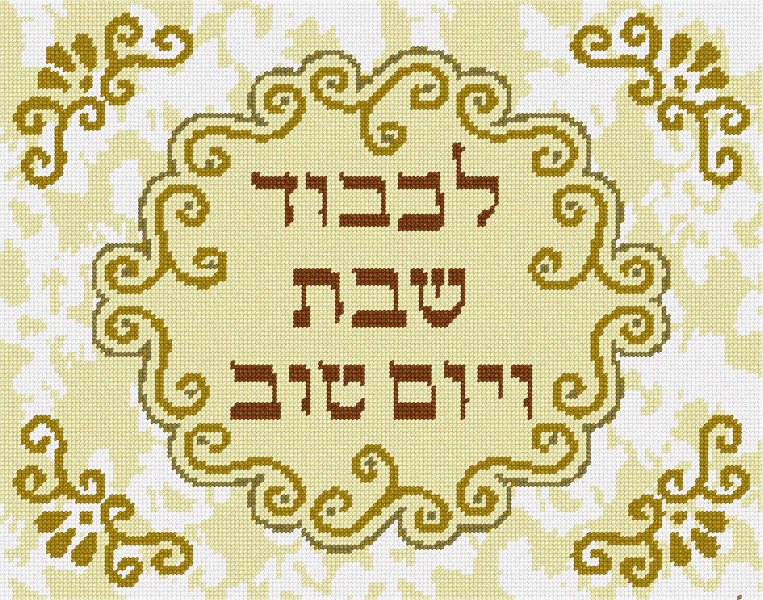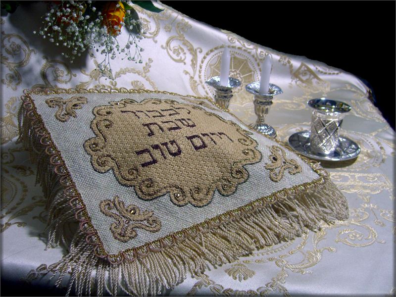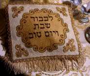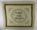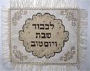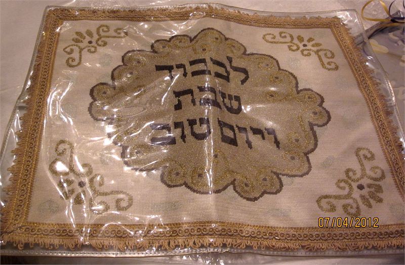 Challah cover with marbleized background, flourish frame, and inset Hebrew lettering. Stitch the front of this fantastic challah cover. Then it is given to a professional finisher who blocks it, sews a lining, and attaches a fringe or rope border edge.