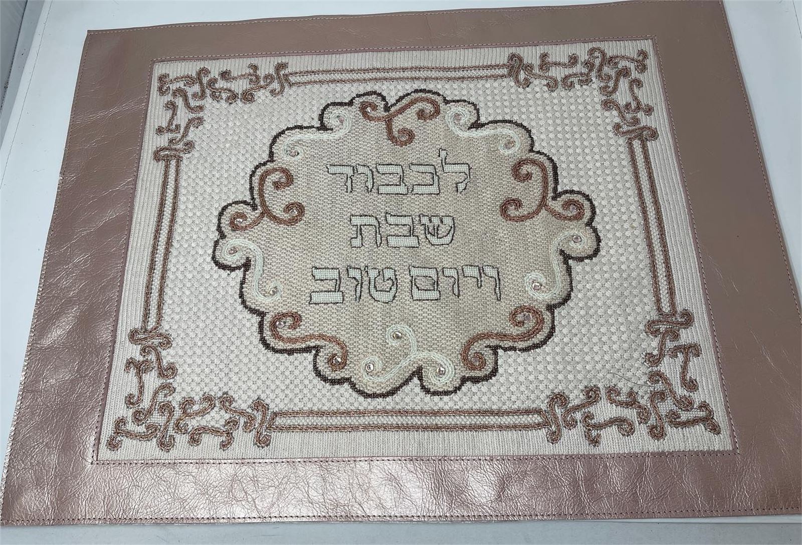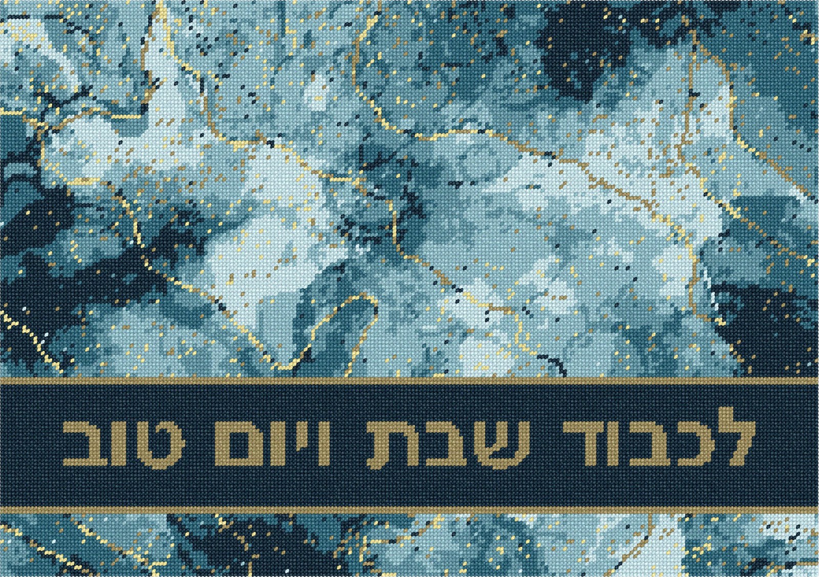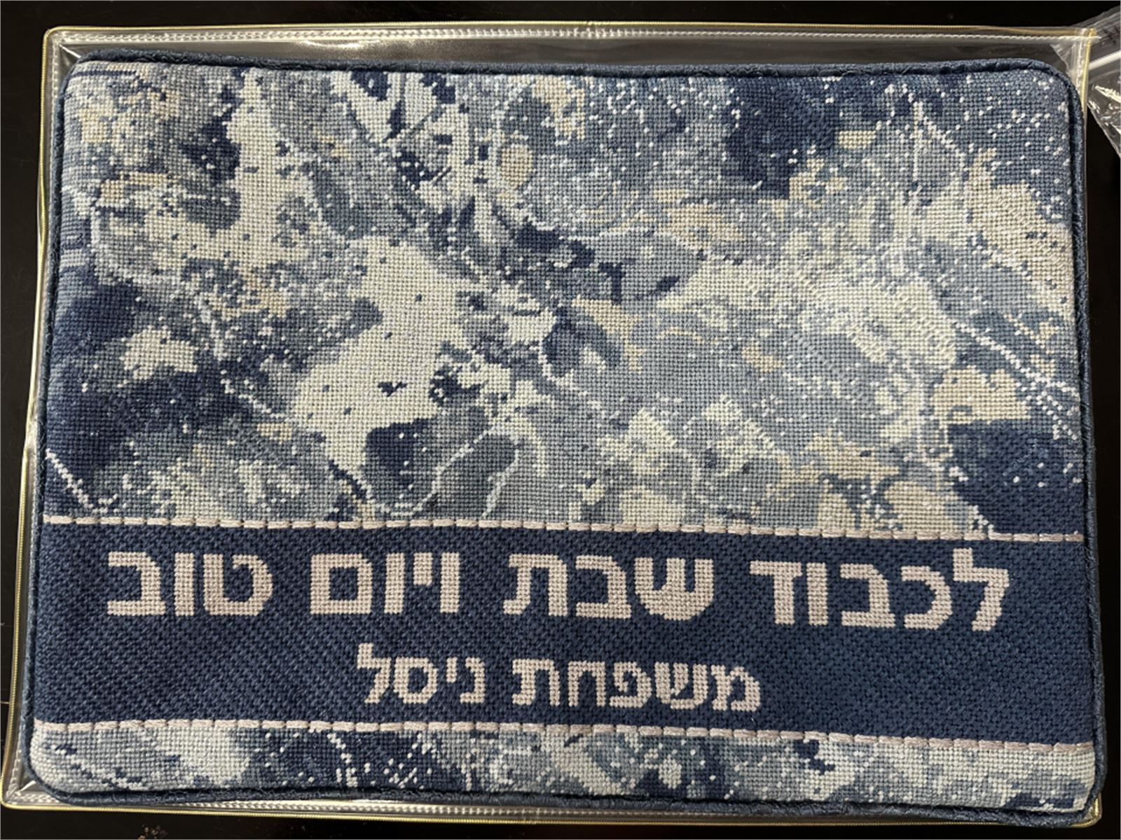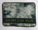 Gorgeous challah cover with a modern marble design. Flecks of gold enhance the marbleized effect. It says "In Honor of Shabbas and Yom Tov" in Hebrew. You stitch the front. After it is completely stitched, it is sent to a professional finisher who adds a lining and a fringe or rope border.