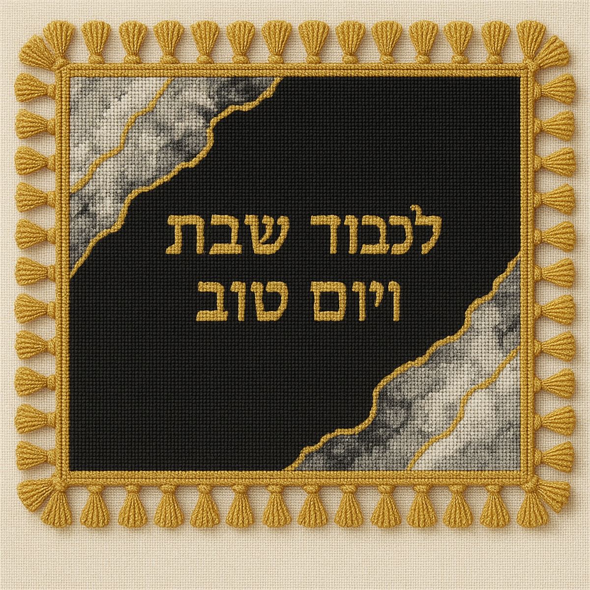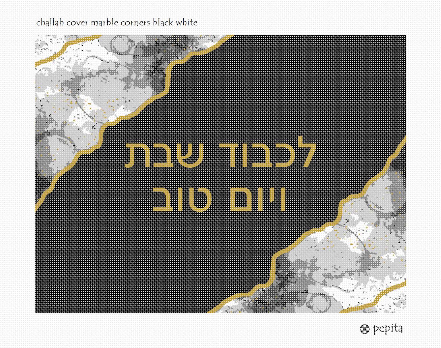 Gorgeous challah cover needlepoint with a modern black and white marble design. Flecks of gold enhance the marbleized effect. After it is completely stitched, it is sent to a professional finisher who turns it into a challah cover for your Shabbat table. The results are magnificent and breathtaking! This is also available in tallit and tefillin bag designs.