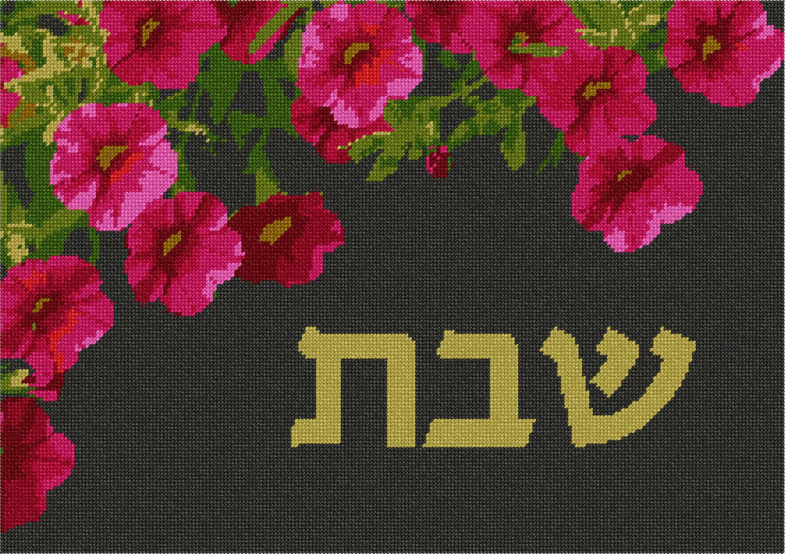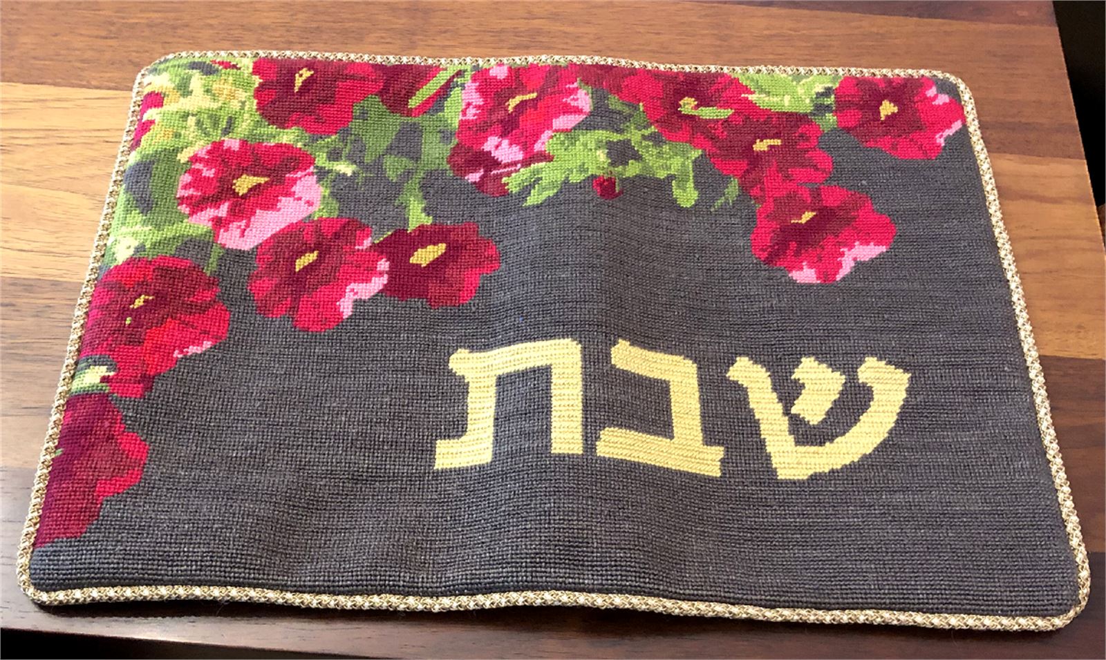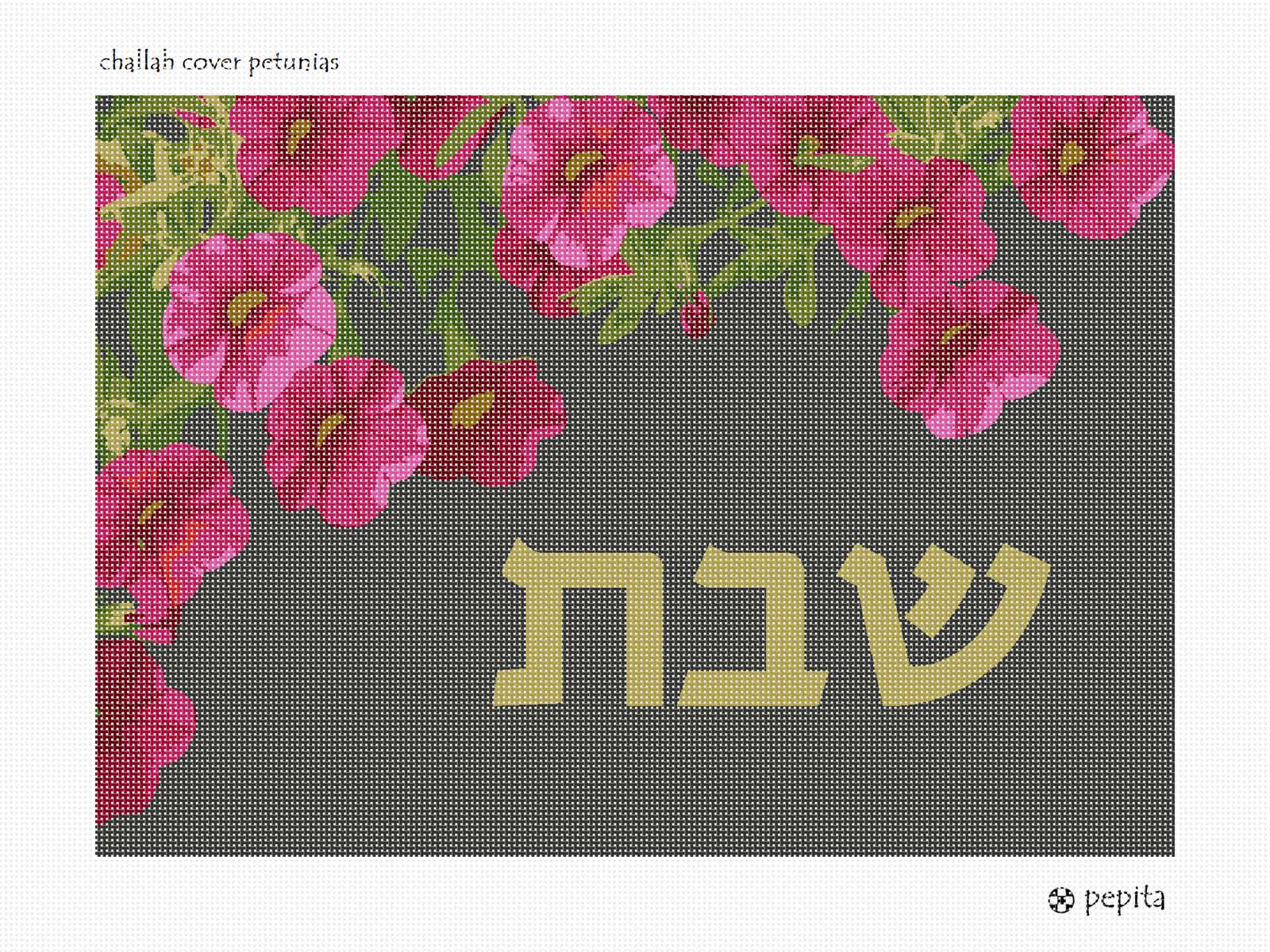 Breathtaking challah cover with a spray of fresh petunias. You stitch the front. After it is completely stitched, it is sent to a professional finisher who adds a lining and a fringe or rope border.