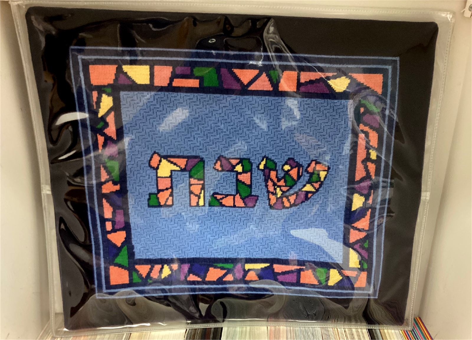 Stitch the center of this challah cover and have it finished in faux crocodile leather or velvet. Build it out to the size of your choice. Less stitching means a cheaper and quicker finished product. Stitch the front of this fantastic challah cover. Then it is given to a professional finisher who blocks it, sews a lining, and attaches a fringe or rope border edge.