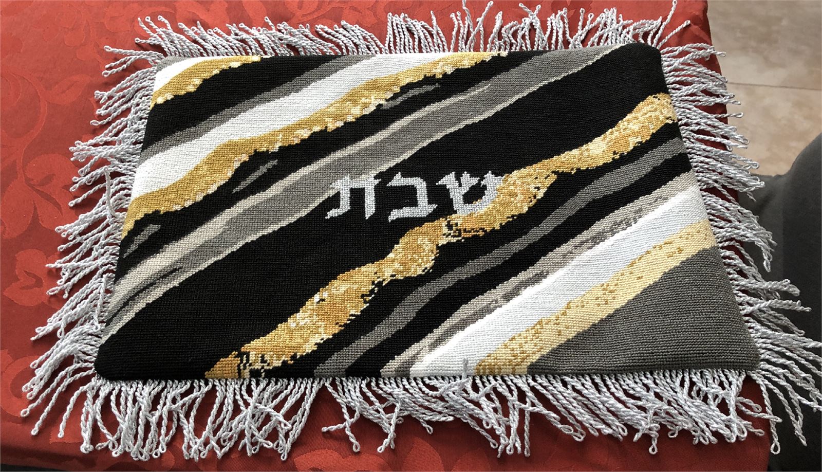 A geode is a stone having a cavity lined with crystals or mineral matter. Most geodes contain clear quartz crystals. Geodes are found all over the world especially in desert regions. This summer I experimented with resin art to create geode looks on glass. That inspired me to design tefillin, tallit, and challah covers with geode characteristics. This challah cover needlepoint will enhance and Shabbat meal. I lvoe the classic black and white with the modern twist of gold leaf resin.
