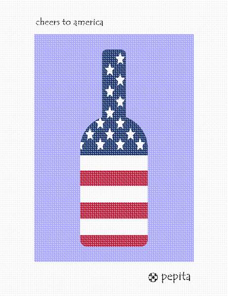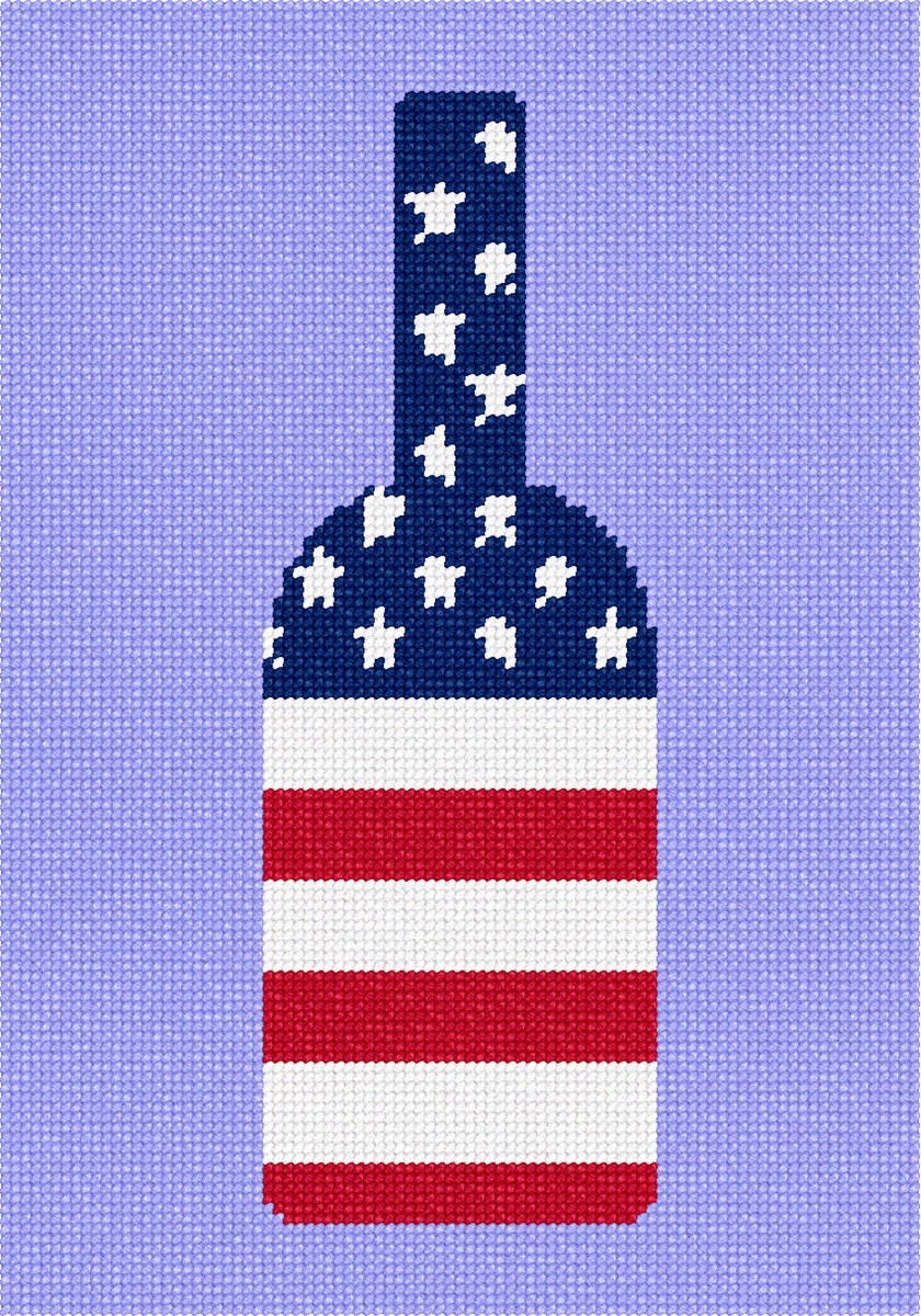 Bottle of wine or champagne with the American flag. "The colors of the pales (the vertical stripes) are those used in the flag of the United States of America; White signifies purity and innocence, Red, hardiness & valour, and Blue, the color of the Chief (the broad band above the stripes) signifies vigilance, perseverance & justice."