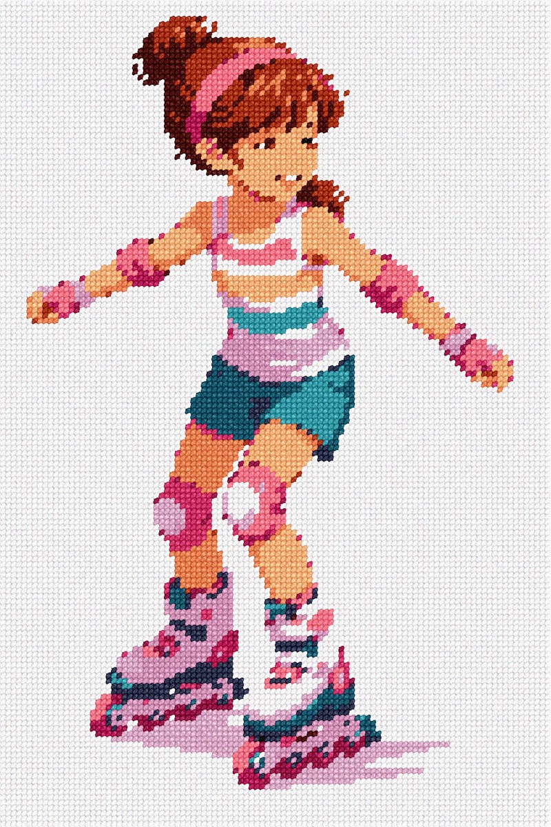This energetic design shows a young girl rollerblading with confidence and motion, rendered in a bright, low-color style. Its playful sense of movement and color makes it ideal for sporty, fun-loving environments.