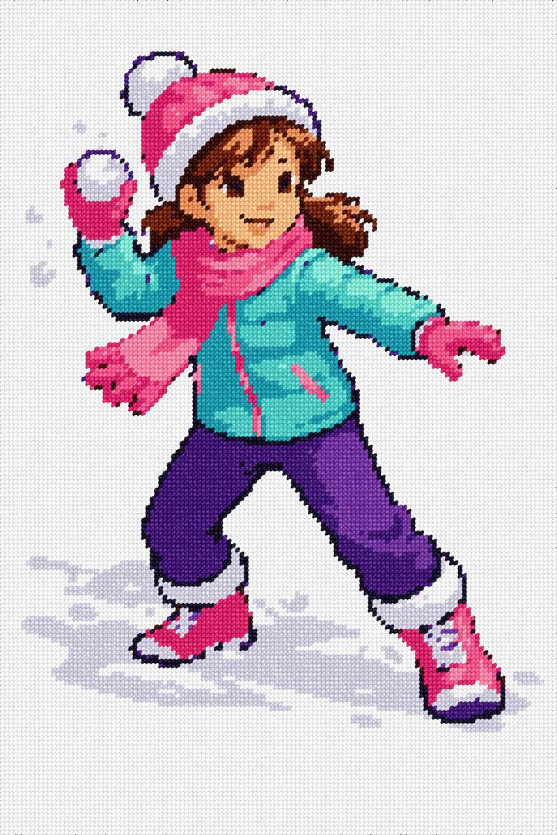 A lively depiction of a child joyfully engaged in a snowball fight takes center stage, capturing the playful essence of winter fun. The vibrant color palette of bright blues, pinks, and purples enhances the cheerful and energetic mood. Dynamic composition and expressive details draw the viewer into the whimsical scene, brimming with youthful exuberance.