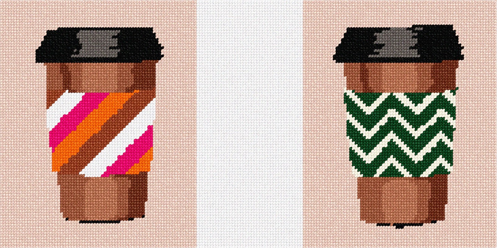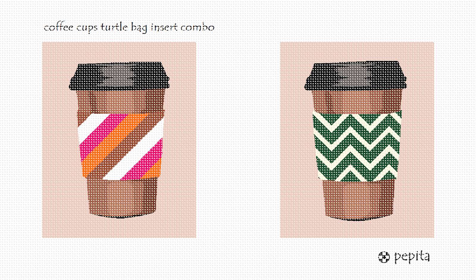Stitch a shell for your new turtle bag. Turtle bags are tote bags that come with two windows for interchangeable designs. This set has two designs that match. Stitch them both and switch off the inserts. Save money by purchasing a combo. These needlepoints can also be stitched as regular projects. They measure 5.5 X 7, so adjust the stitching area to 5 X 7 and frame with a ready made frame. This combo has two coffee cups with geometric sleeves of diagonal stripes and chevron. This is a perfect holiday gift for anyone who loves coffee or the person in your life who you go out and grab a coffee with.