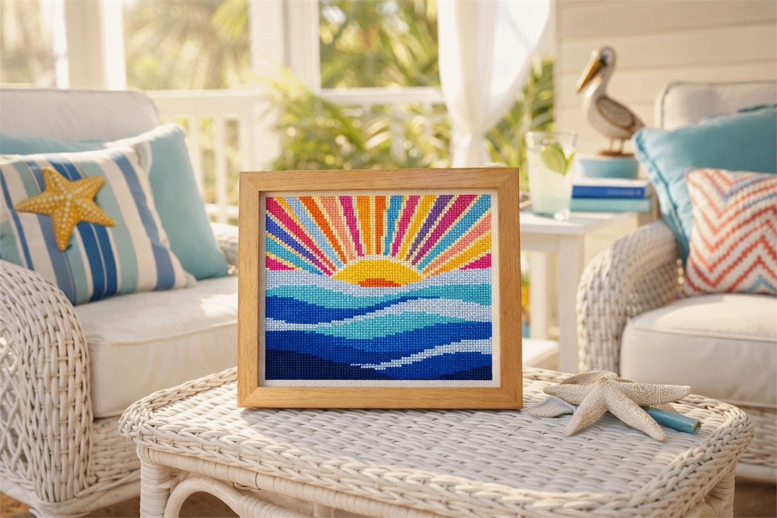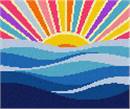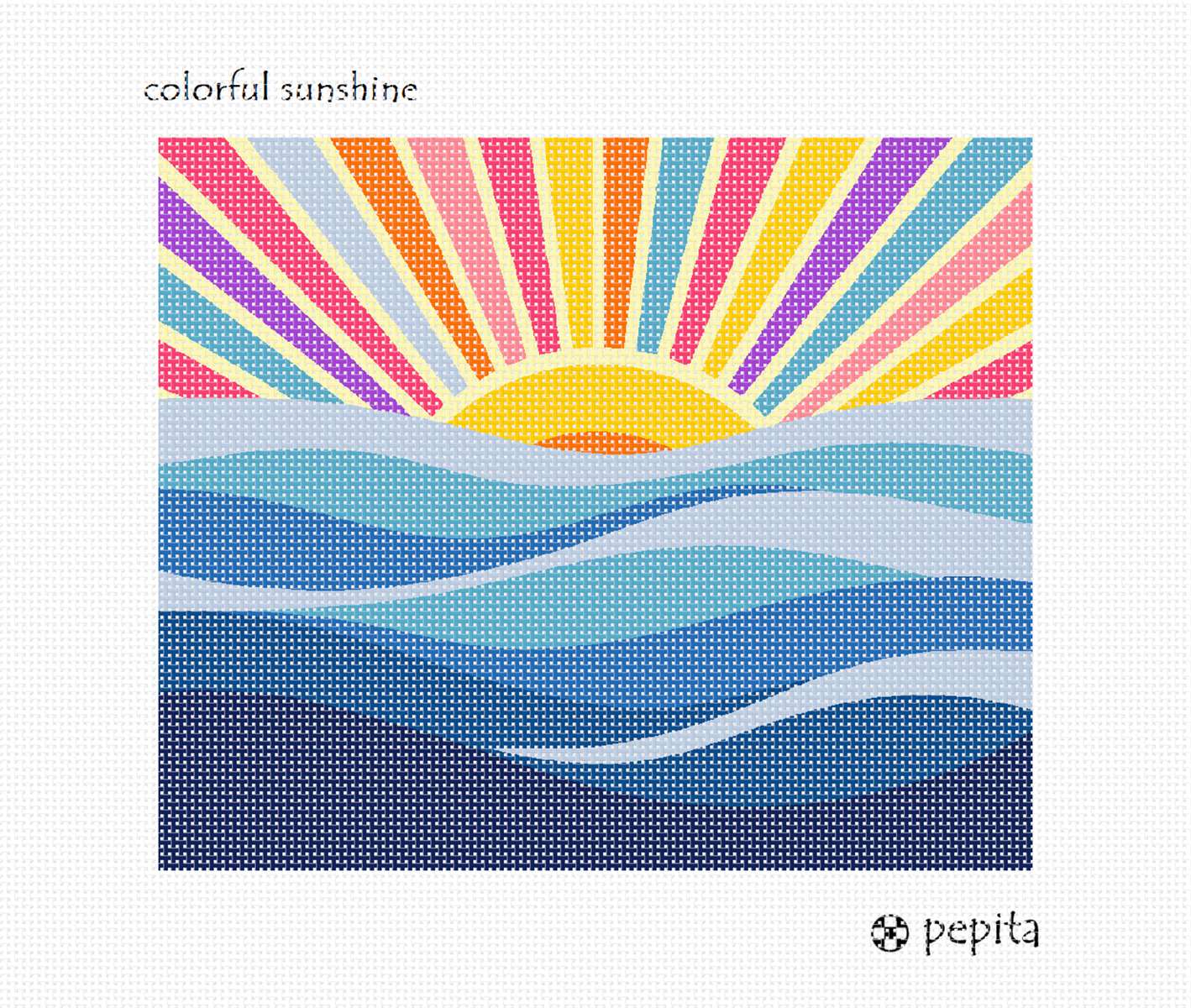 A bold, modern needlepoint design that celebrates warmth and joy. Featuring a radiant sun with vibrant, playful rays rising over softly layered water, this design blends abstract geometry with an instantly recognizable coastal scene. The clean shapes and high-contrast colors make it both satisfying to stitch and striking when finished. Perfect for contemporary interiors, beach homes, or anyone looking to add a bright pop of color and an uplifting mood to any space.