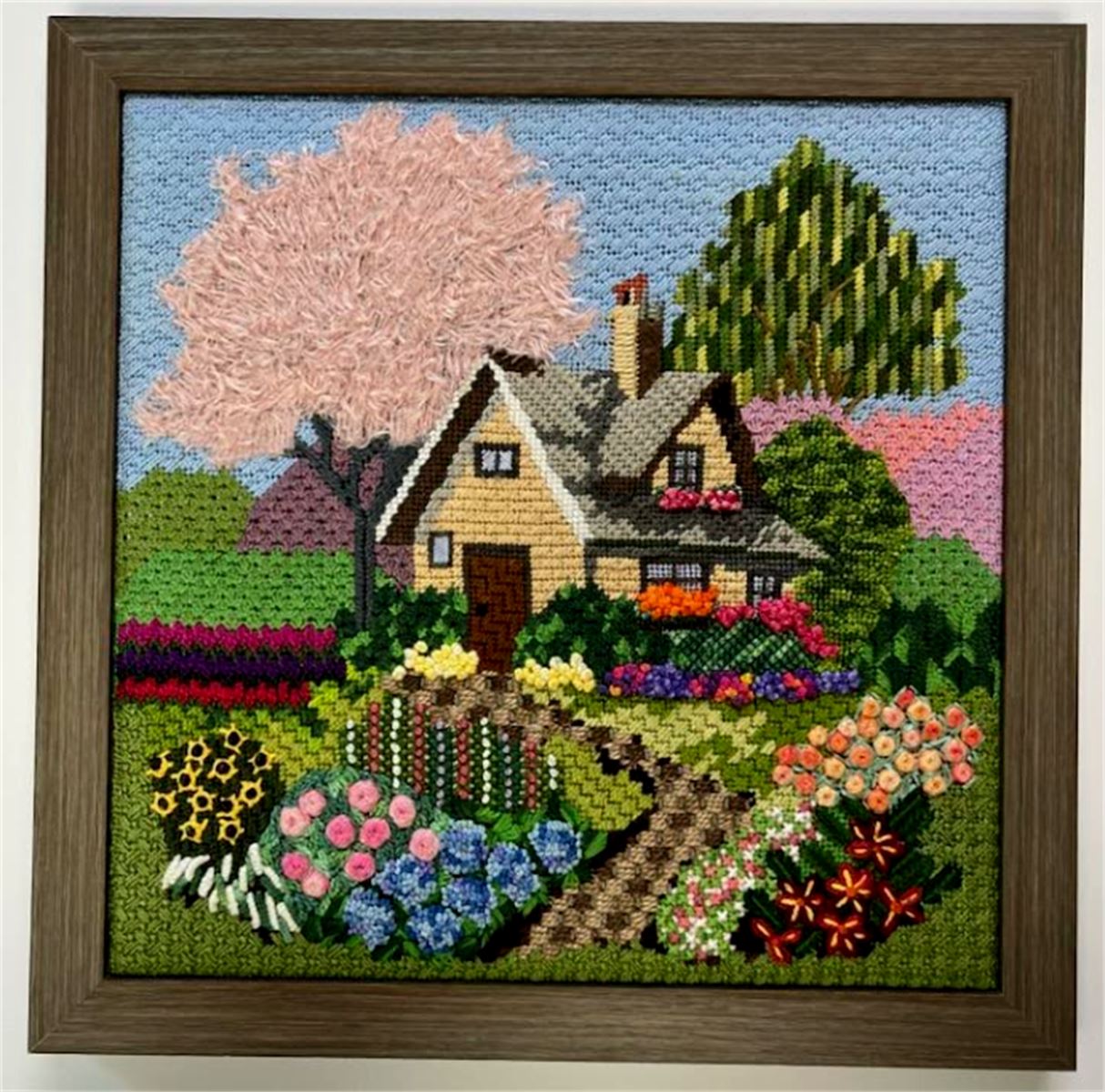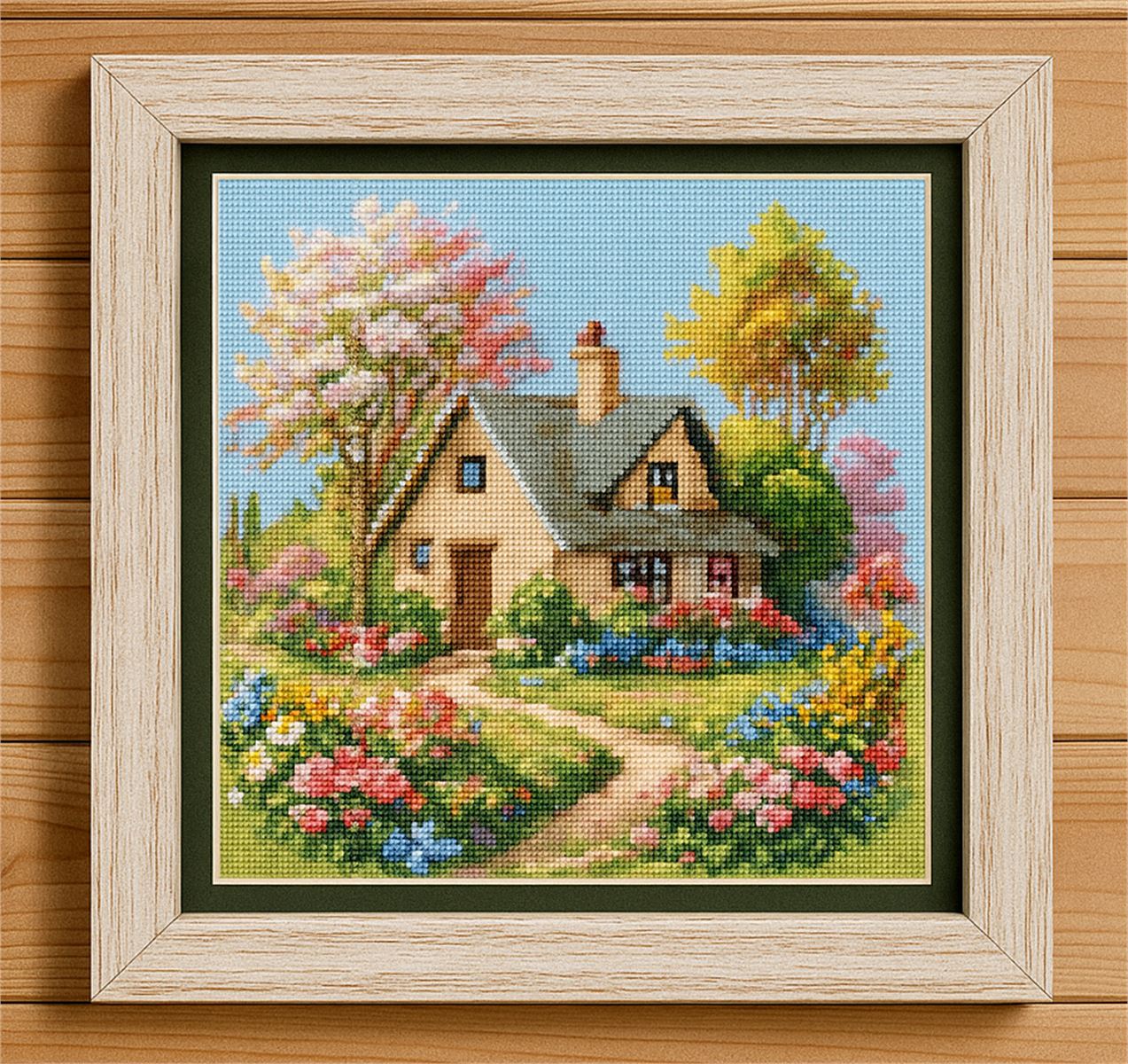 Don't you wish you can live in one of these cottages in real life? The flowers are blooming, the sky is clear of clouds, and the path is inviting. Stitch this colorful country cottage scene today.