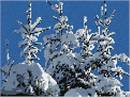 Snow covered trees with the sun casting sparkling shadows on the branches
