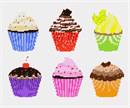 Six colorful cupcakes. Yummy! Cupcakes have been around since the late 1700's. The first mention of the cupcake can be traced as far back as 1796, when a recipe notation of “a cake to be baked in small cups” was written in American Cookery by Amelia Simms.