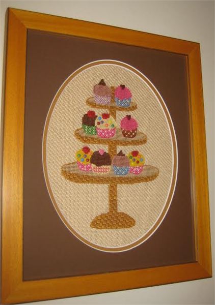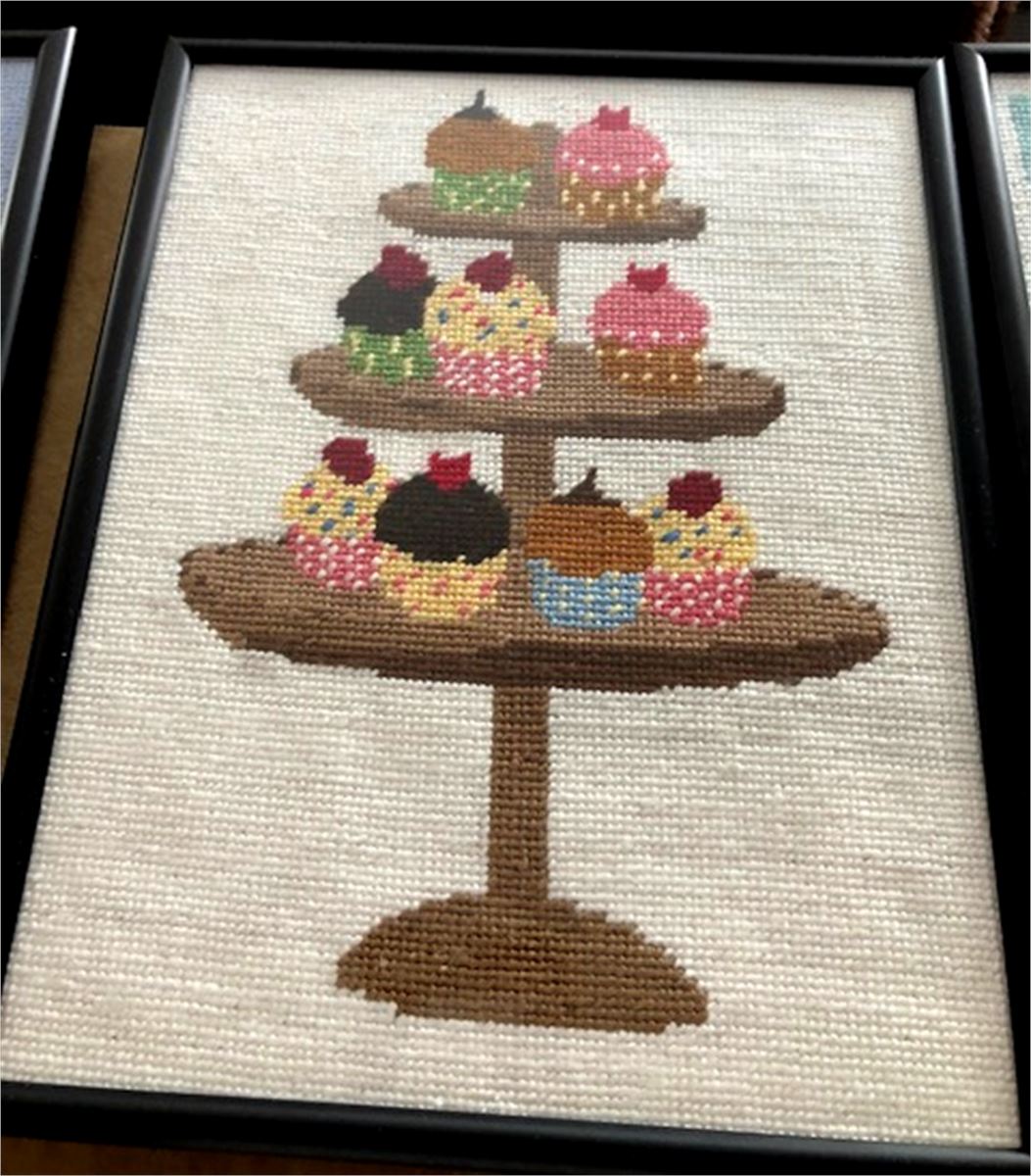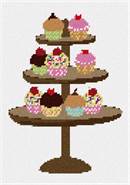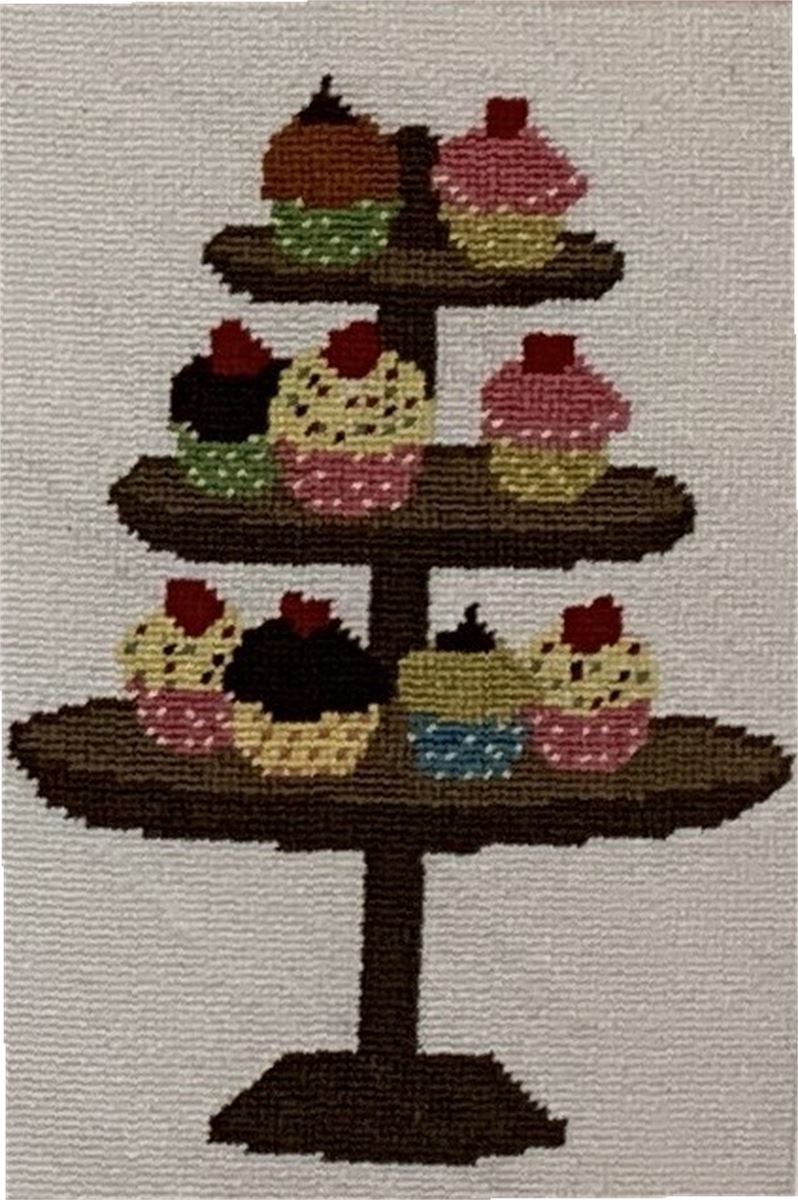Ooh la la! A cupcake display on a stand. This delectable needlepoint makes you hungry to stitch. Cupcakes have been around since the late 1700's. The first mention of the cupcake can be traced as far back as 1796, when a recipe notation of “a cake to be baked in small cups” was written in American Cookery by Amelia Simms.
