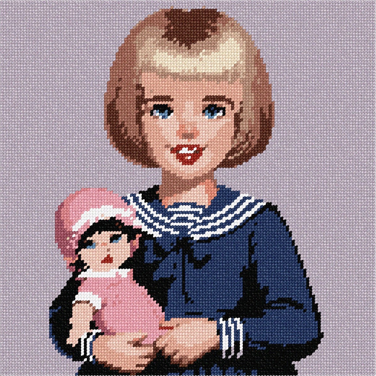 A cute little girl, dressed in a navy suit, holding her own cute little girl doll